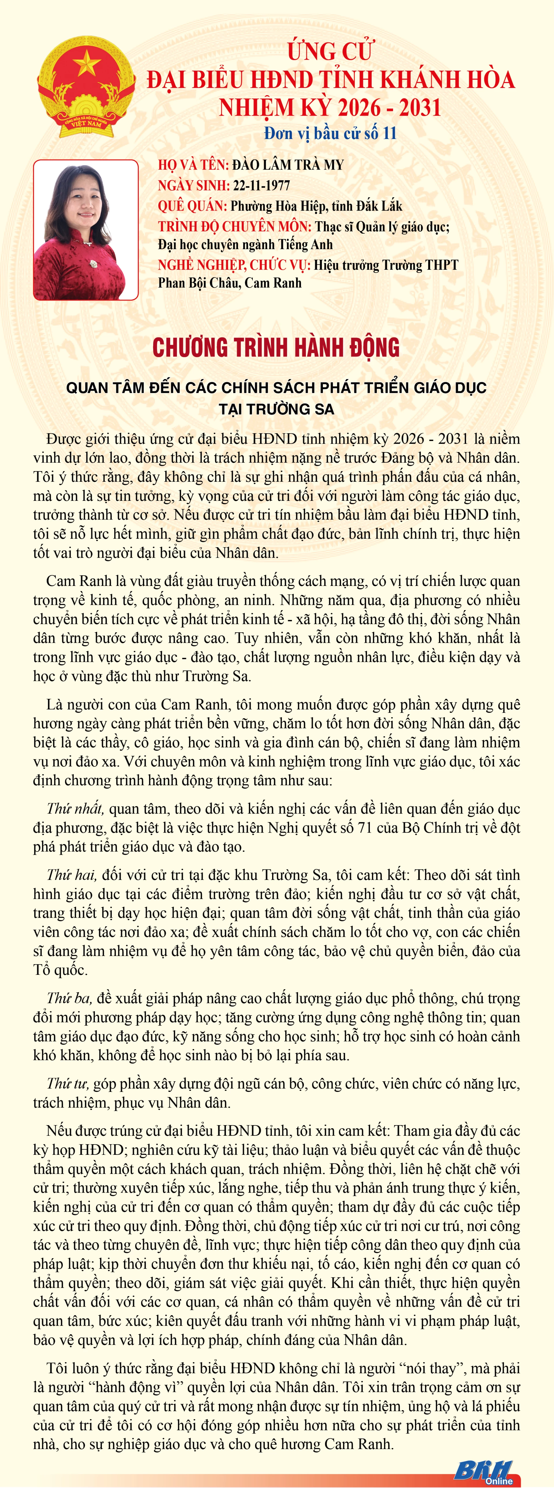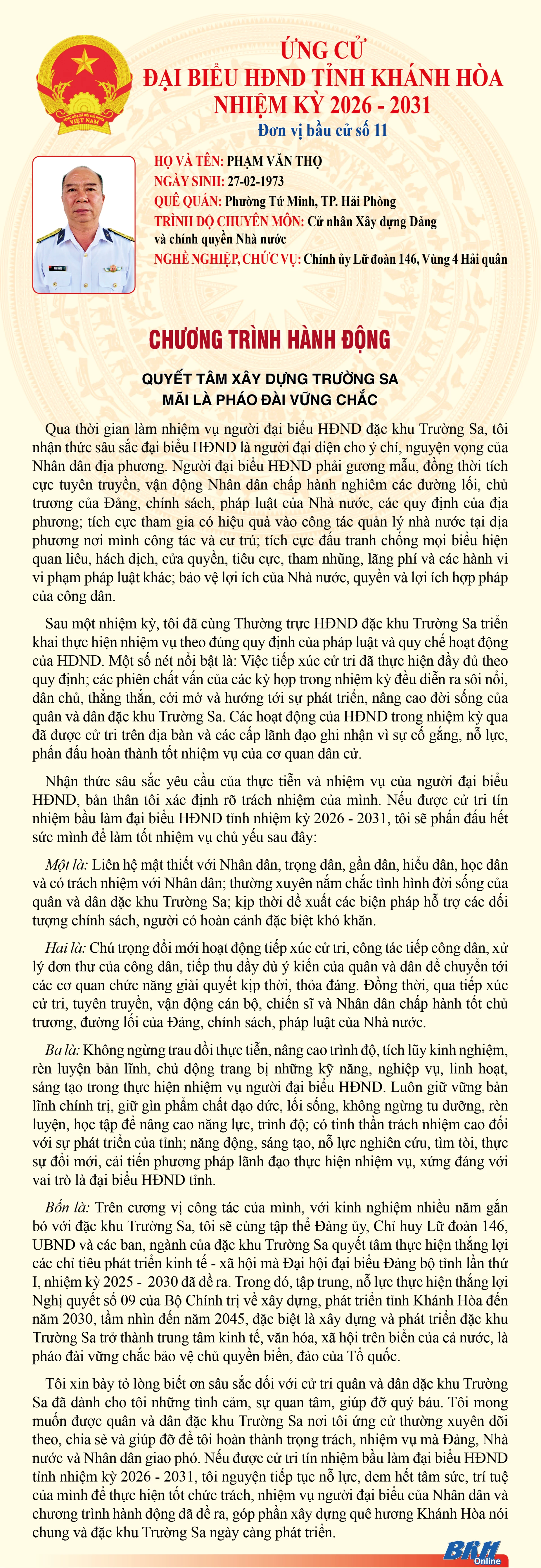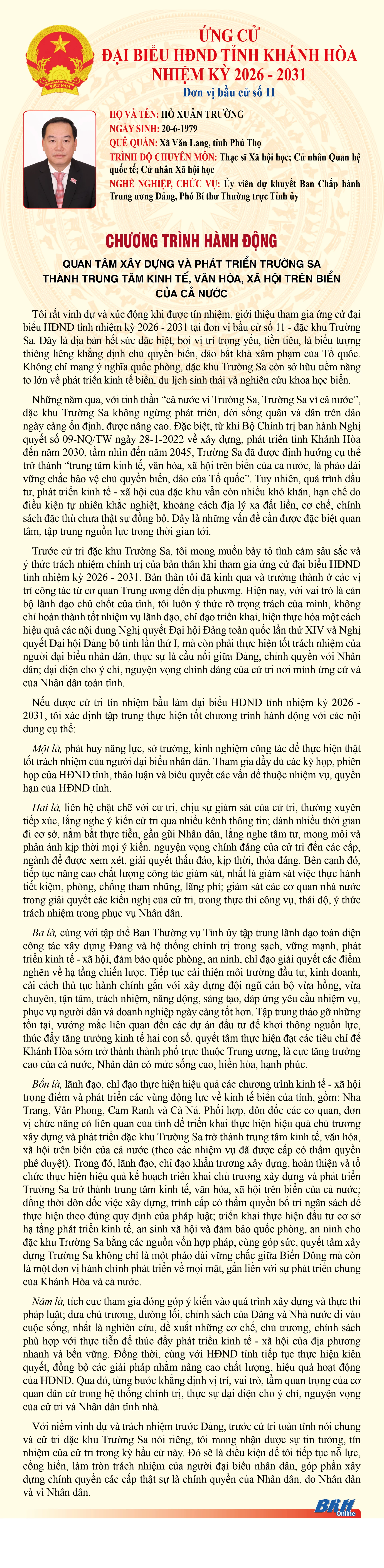 Báo và Phát thanh, Truyền hình Khánh Hòa trân trọng giới thiệu đến cử tri trong tỉnh chương trình hành động của những người ứng cử đại biểu HĐND tỉnh khóa VIII, nhiệm kỳ 2026 - 2031 tại Đơn vị bầu cử số 11 (Gồm: Đặc khu Trường Sa).