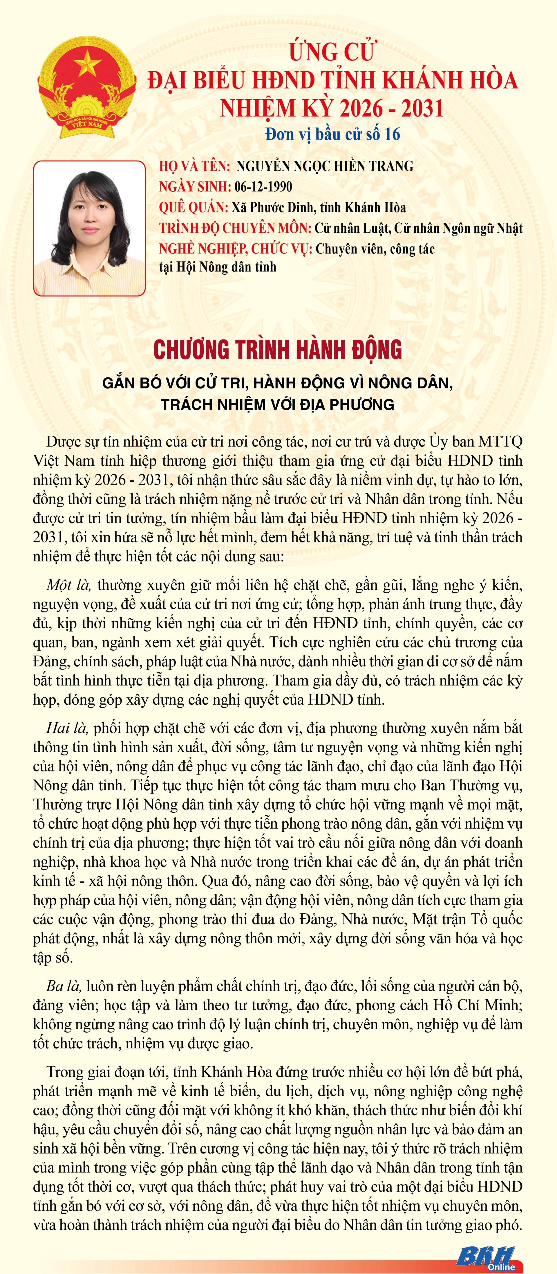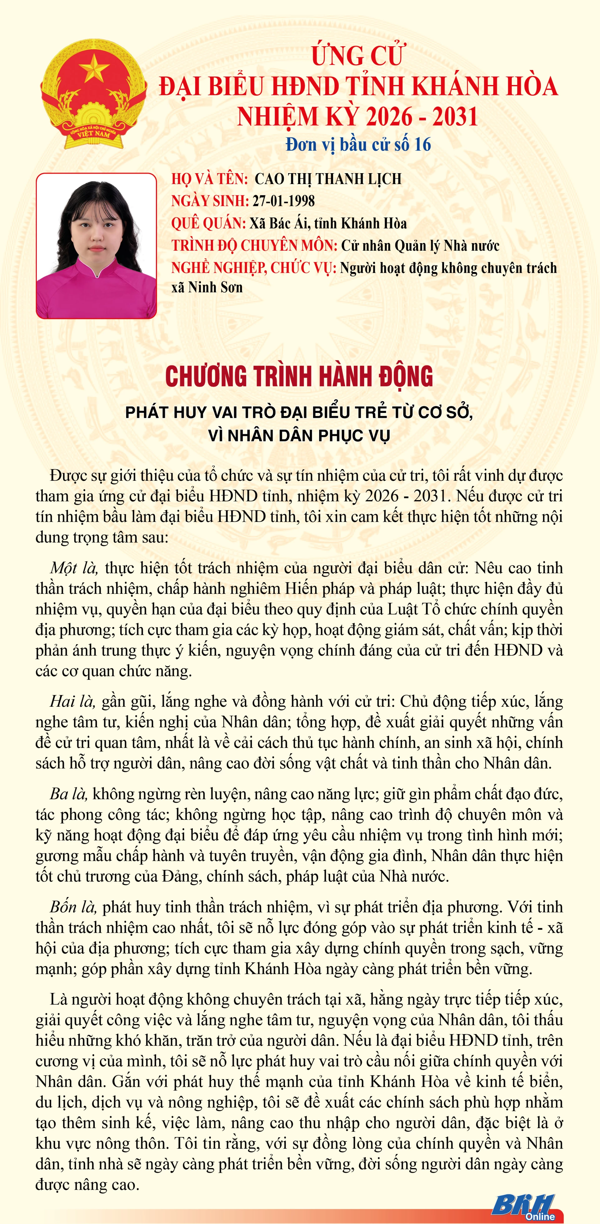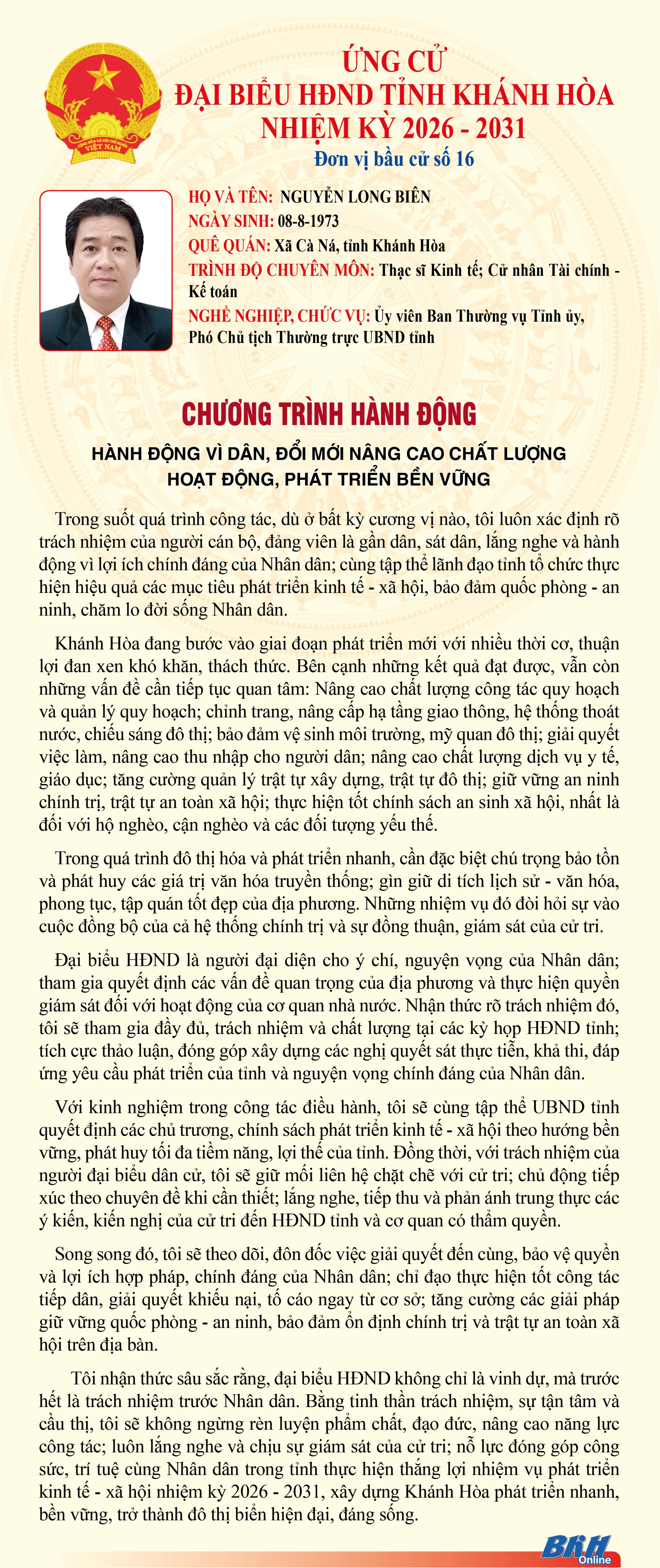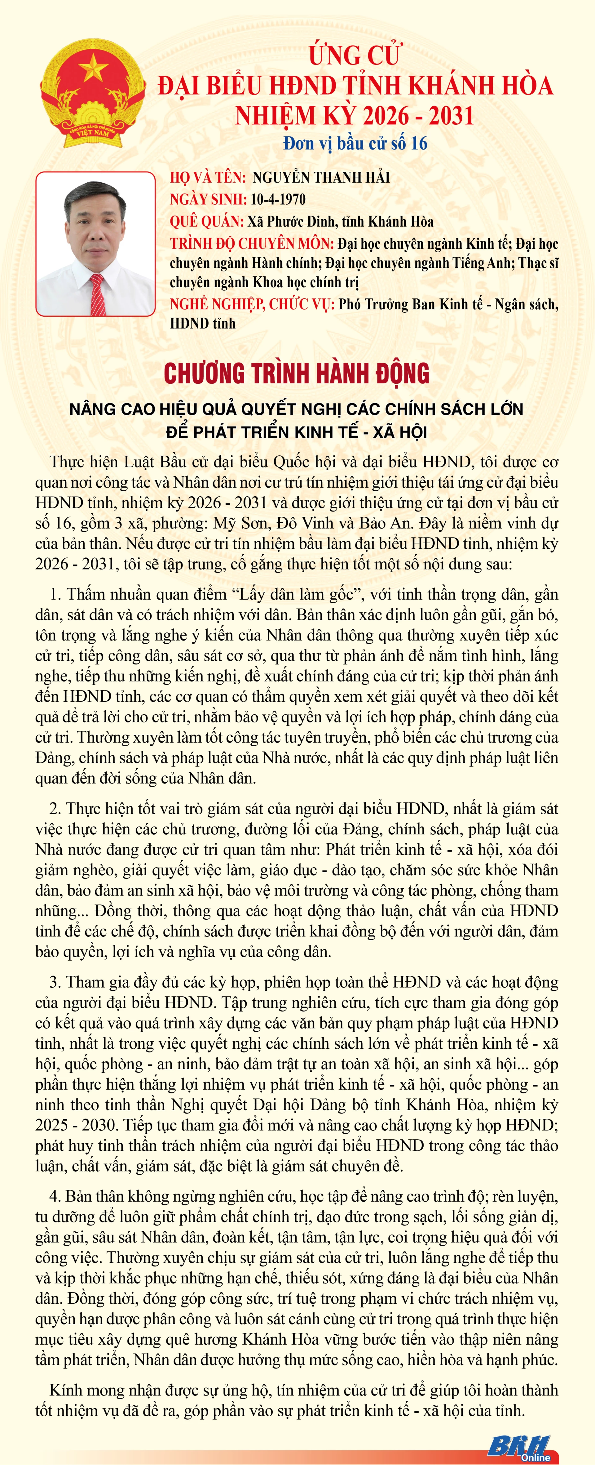 Báo và Phát thanh, Truyền hình Khánh Hòa trân trọng giới thiệu đến cử tri trong tỉnh chương trình hành động của những người ứng cử đại biểu HĐND tỉnh khóa VIII, nhiệm kỳ 2026 - 2031 tại Đơn vị bầu cử số 16 (Gồm: xã Mỹ Sơn, phường Đô Vinh, phường Bảo An).