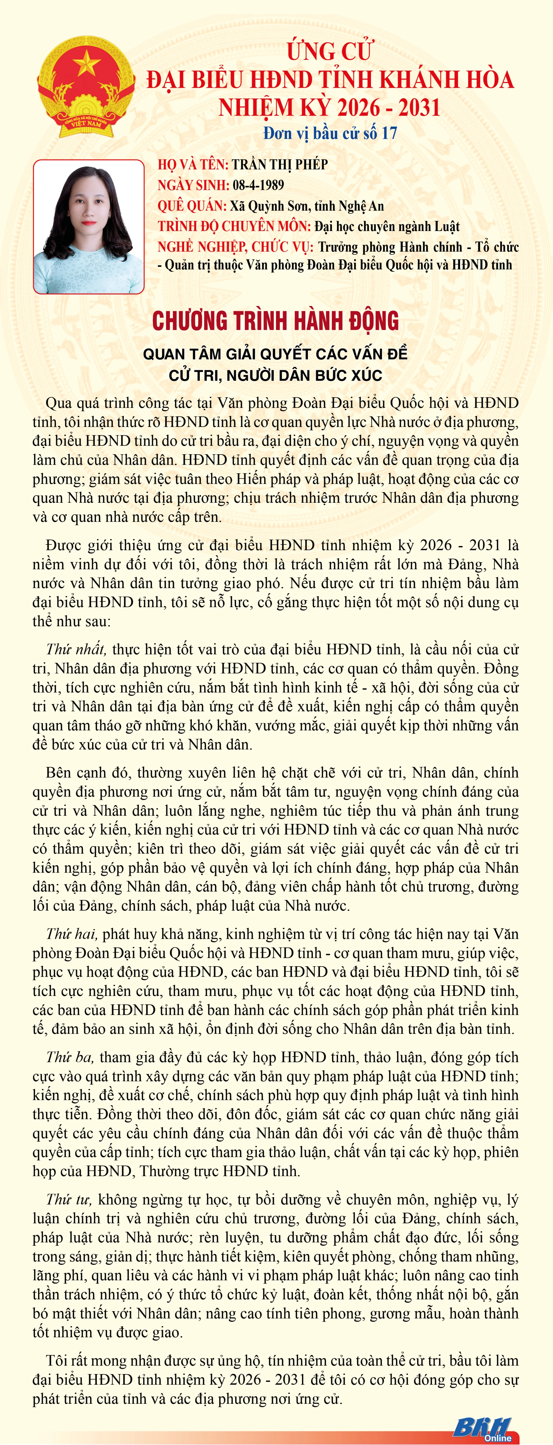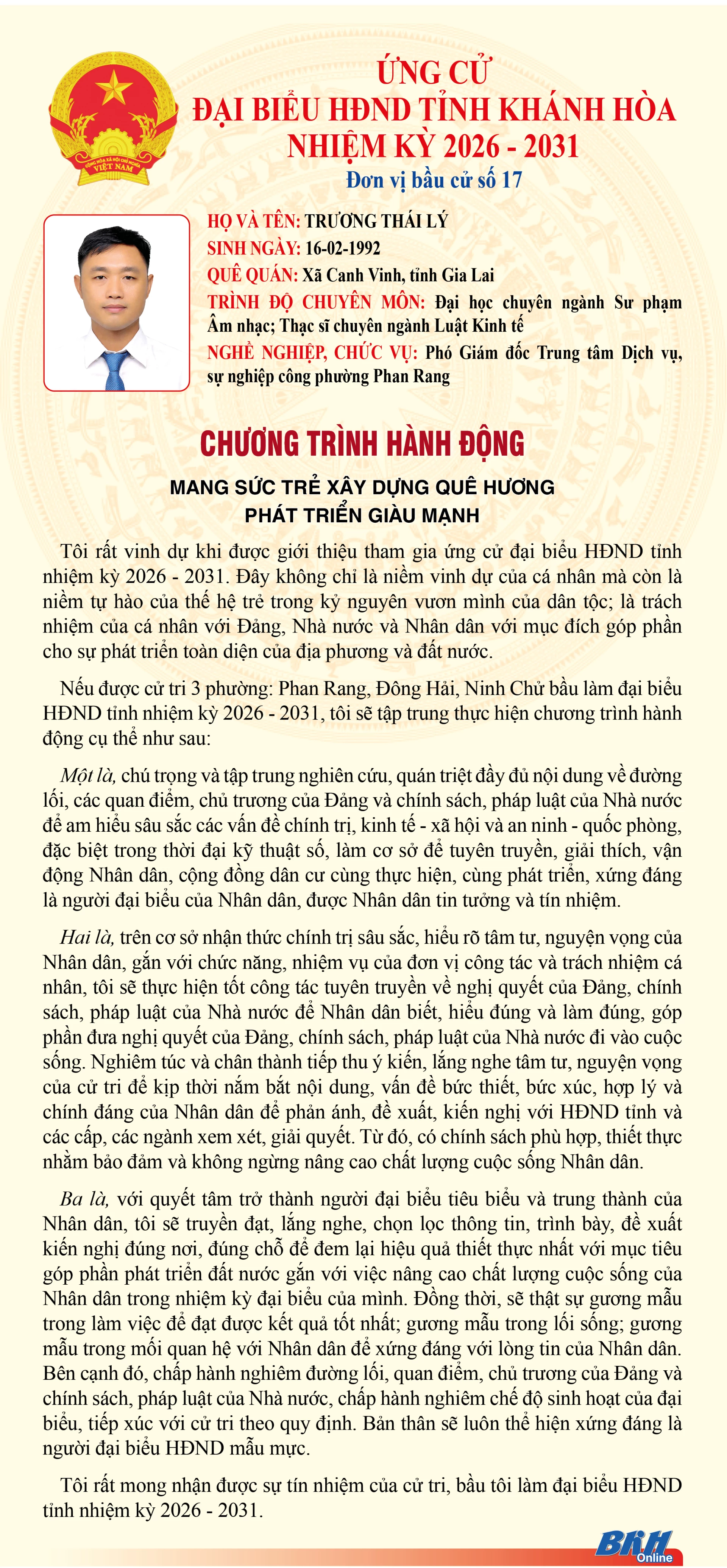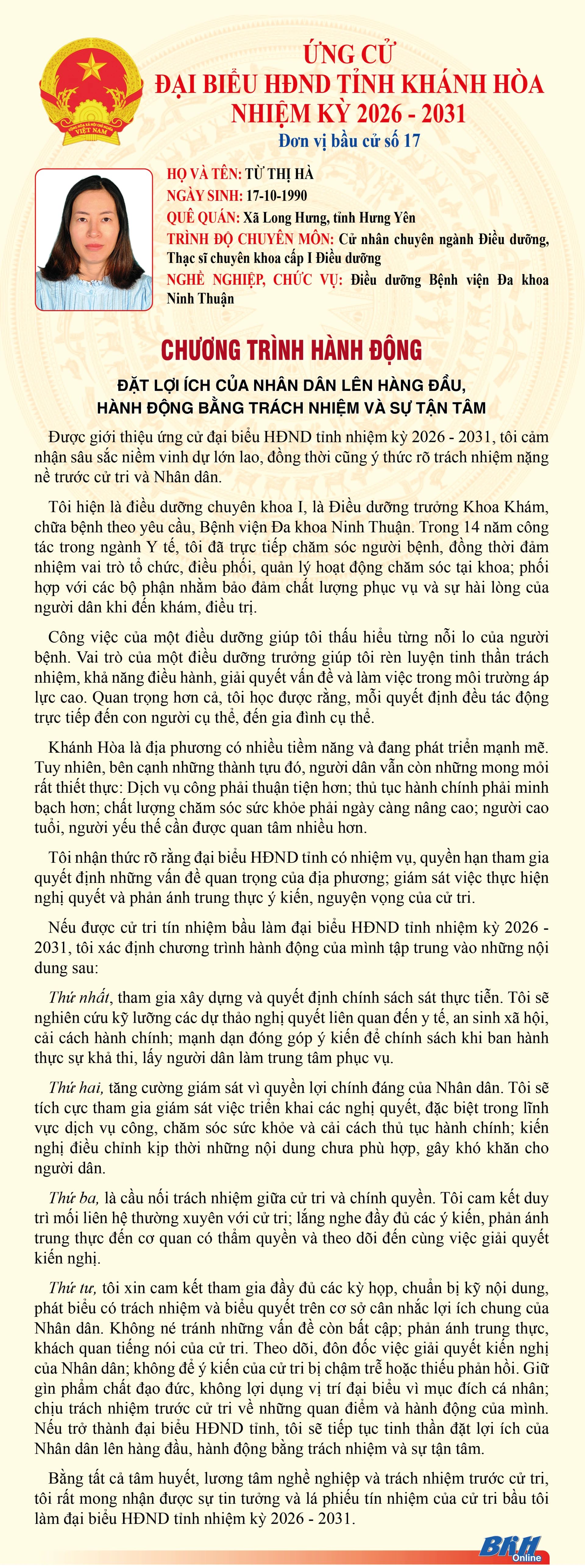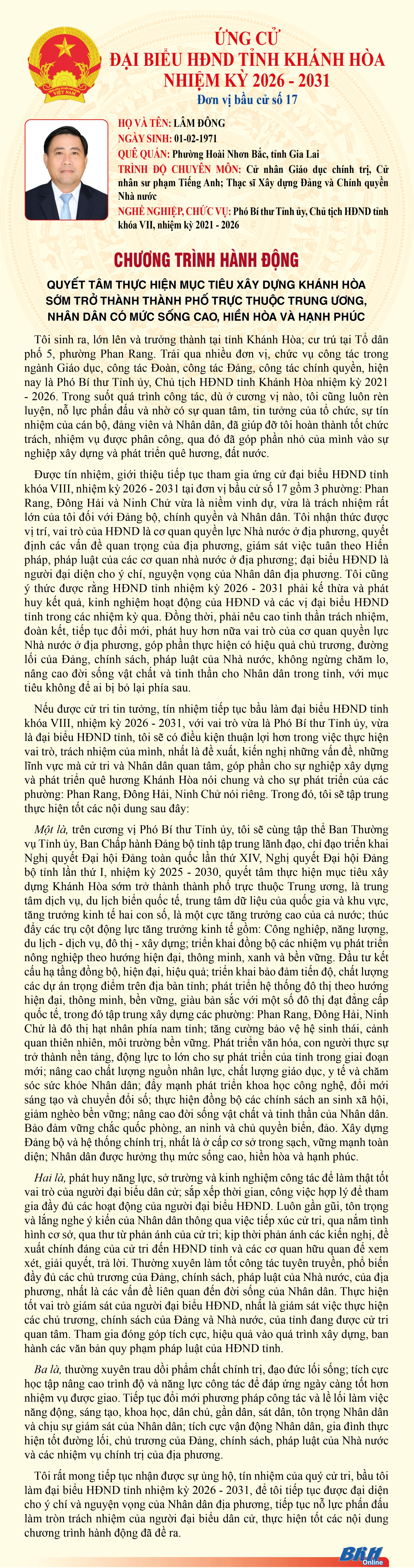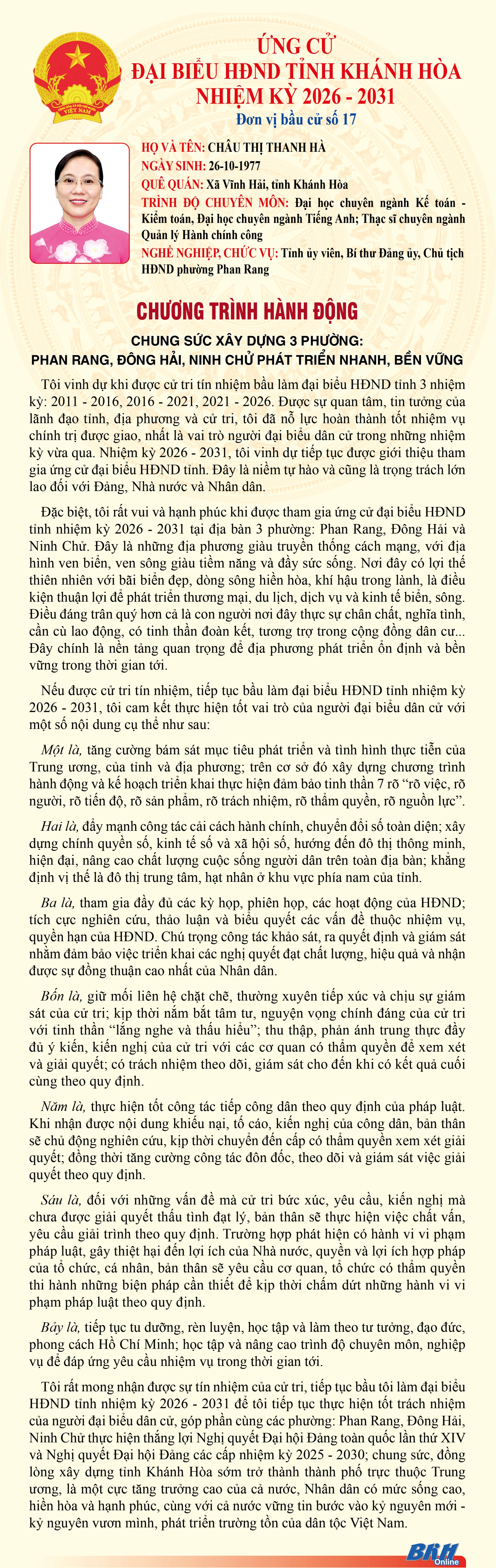 Báo và Phát thanh, Truyền hình Khánh Hòa trân trọng giới thiệu đến cử tri trong tỉnh chương trình hành động của những người ứng cử đại biểu HĐND tỉnh khóa VIII, nhiệm kỳ 2026 - 2031 tại Đơn vị bầu cử số 17 (Gồm: phường Ninh Chử, phường Phan Rang, phường Đông Hải).
