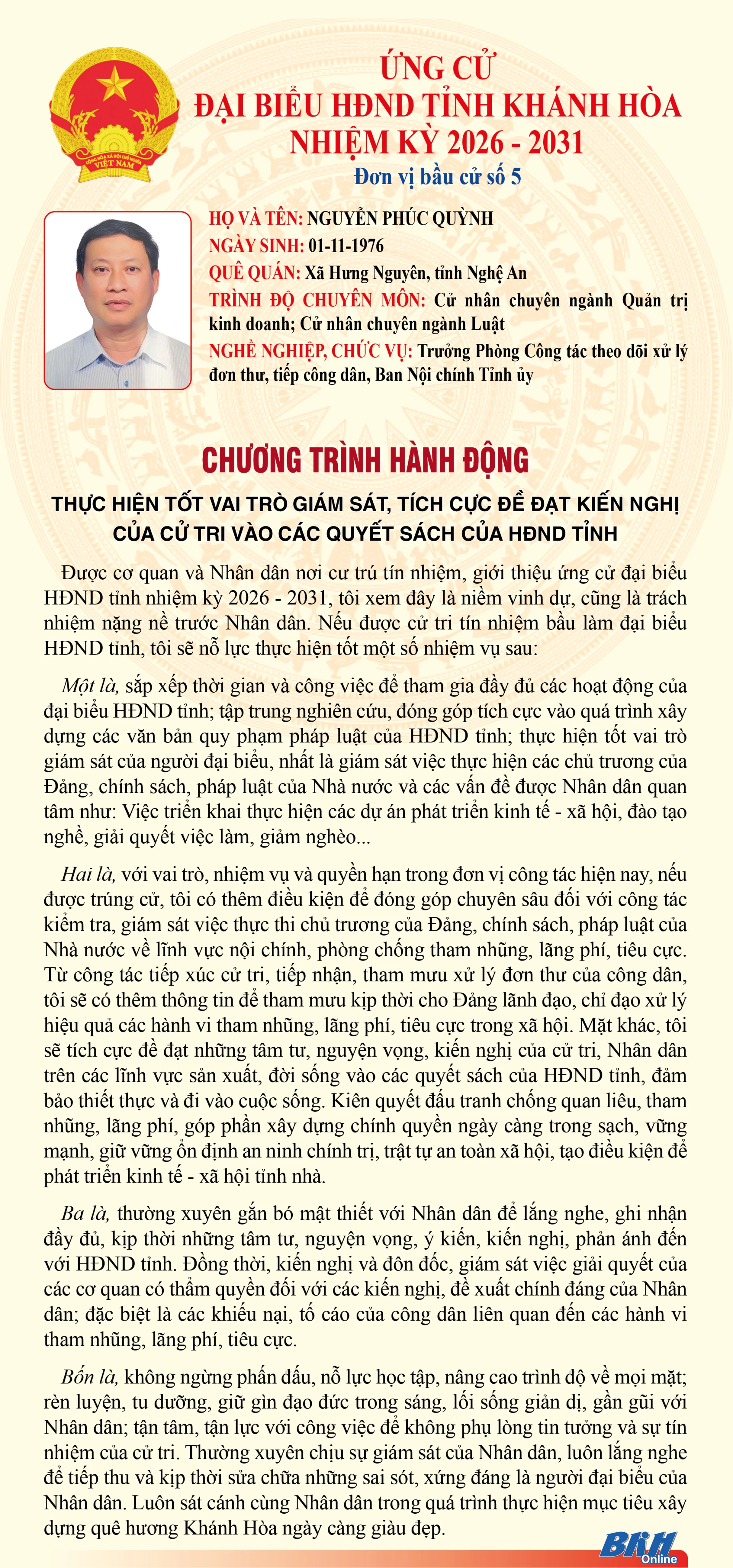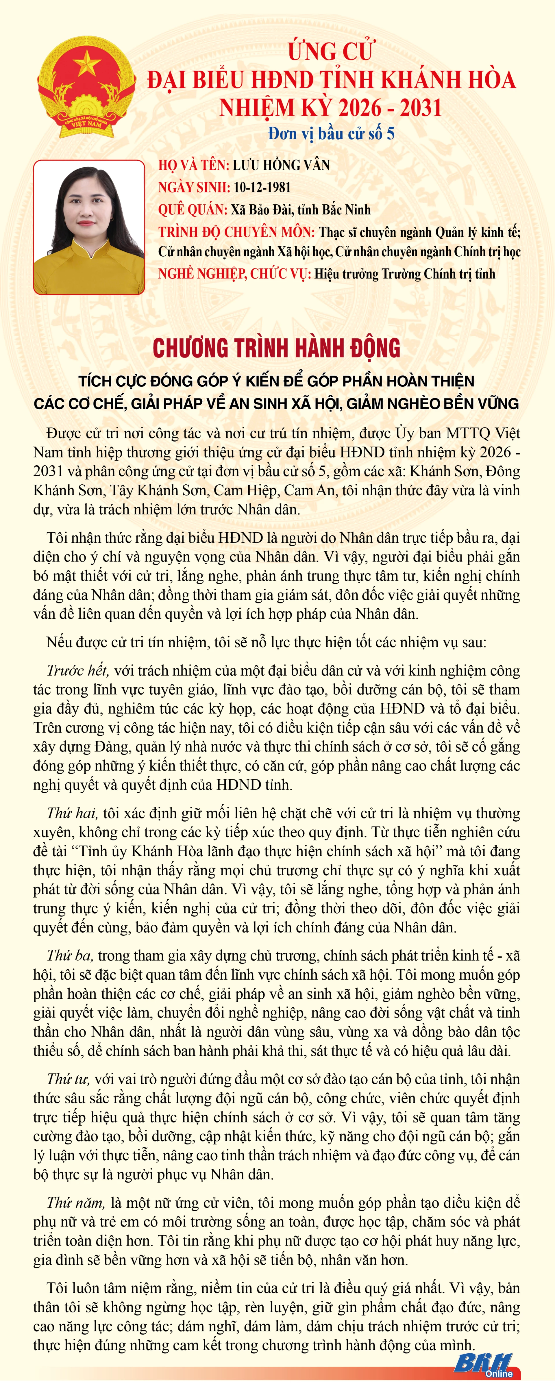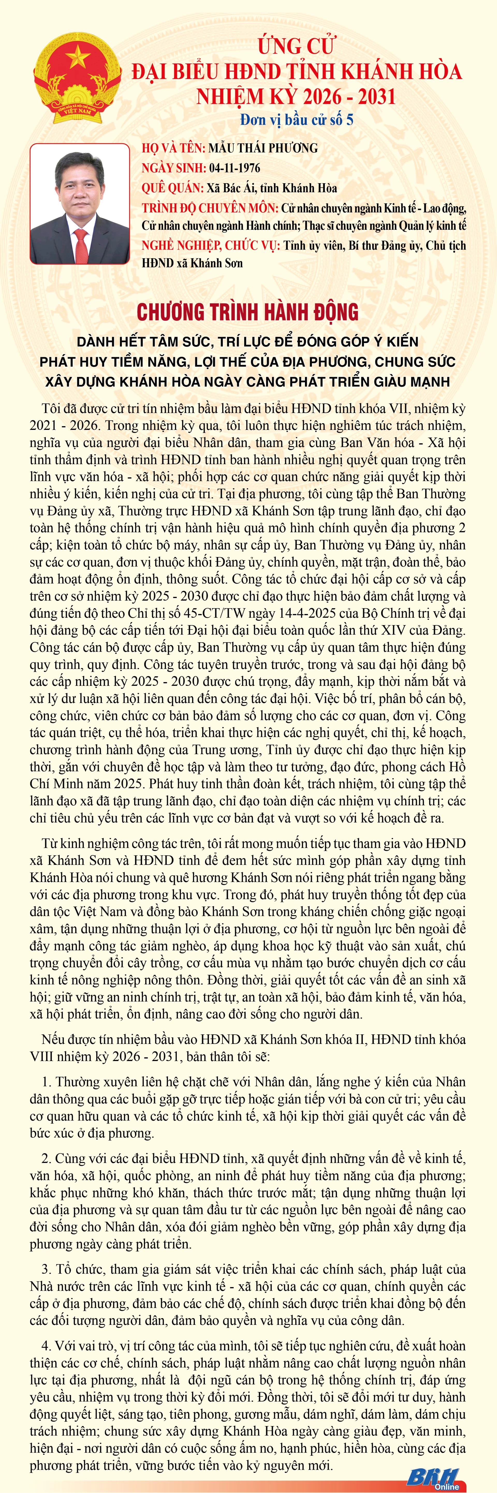 Báo và Phát thanh, Truyền hình Khánh Hòa trân trọng giới thiệu đến cử tri trong tỉnh chương trình hành động của những người ứng cử đại biểu HĐND tỉnh khóa VIII, nhiệm kỳ 2026 - 2031 tại Đơn vị bầu cử số 5 (Gồm: xã Khánh Sơn, xã Đông Khánh Sơn, xã Tây Khánh Sơn, xã Cam Hiệp, xã Cam An).