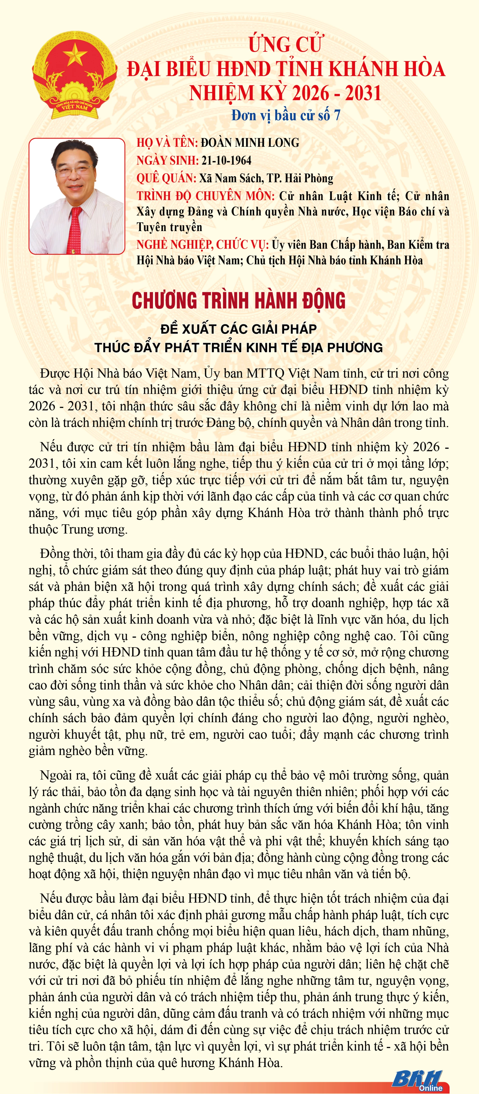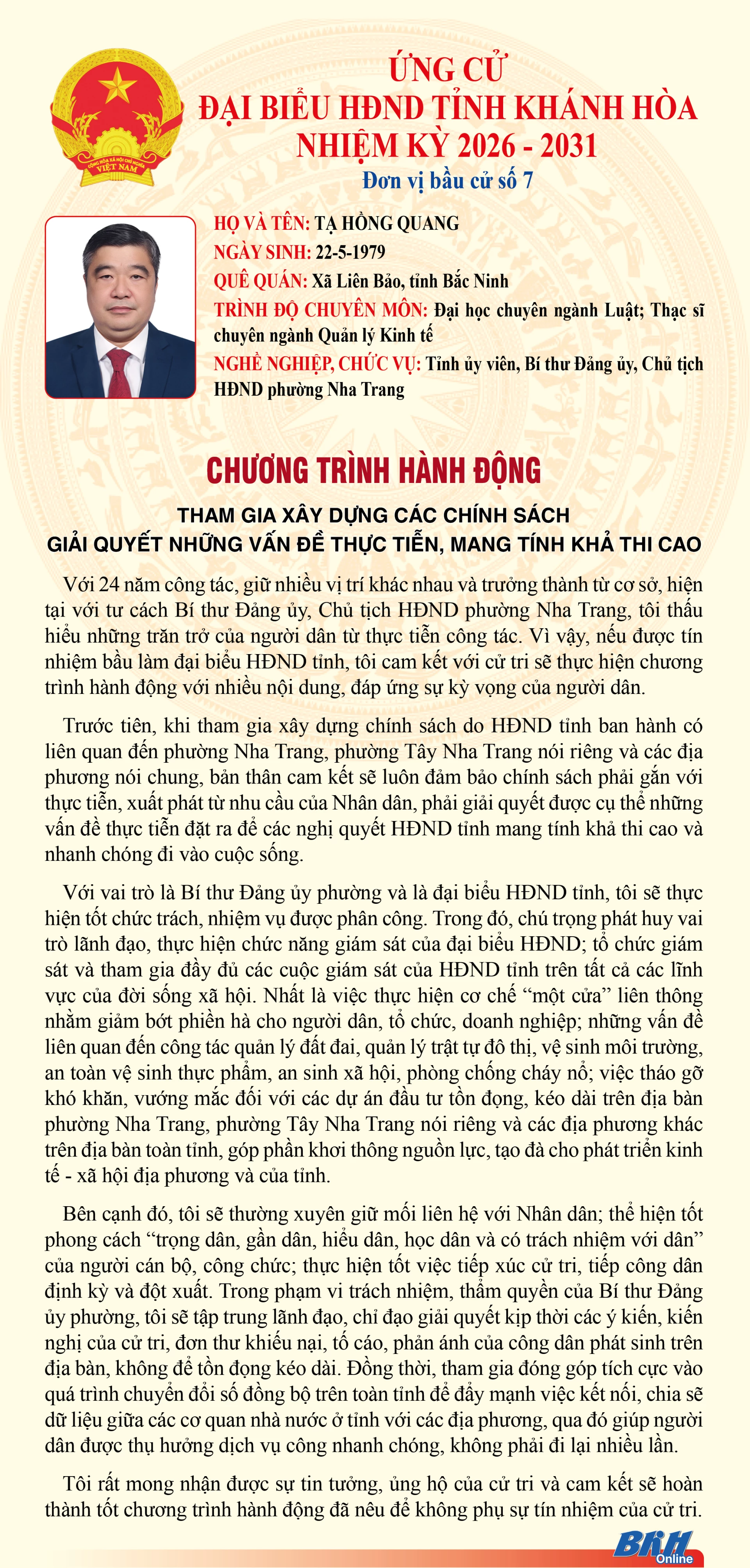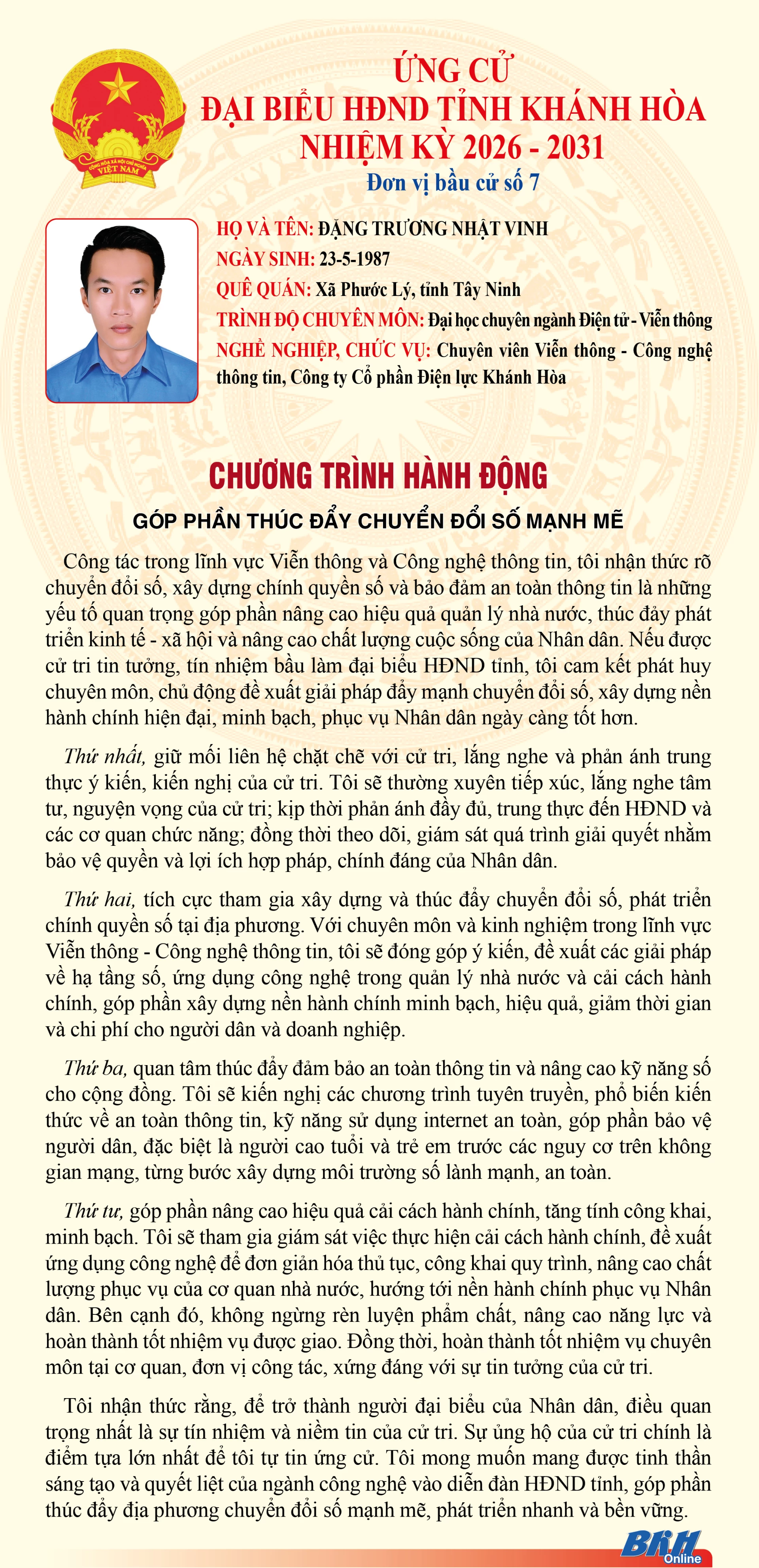 Báo và Phát thanh, Truyền hình Khánh Hòa trân trọng giới thiệu đến cử tri trong tỉnh chương trình hành động của những người ứng cử đại biểu HĐND tỉnh khóa VIII, nhiệm kỳ 2026 - 2031 tại Đơn vị bầu cử số 7 (Gồm: phường Tây Nha Trang, phường Nha Trang).