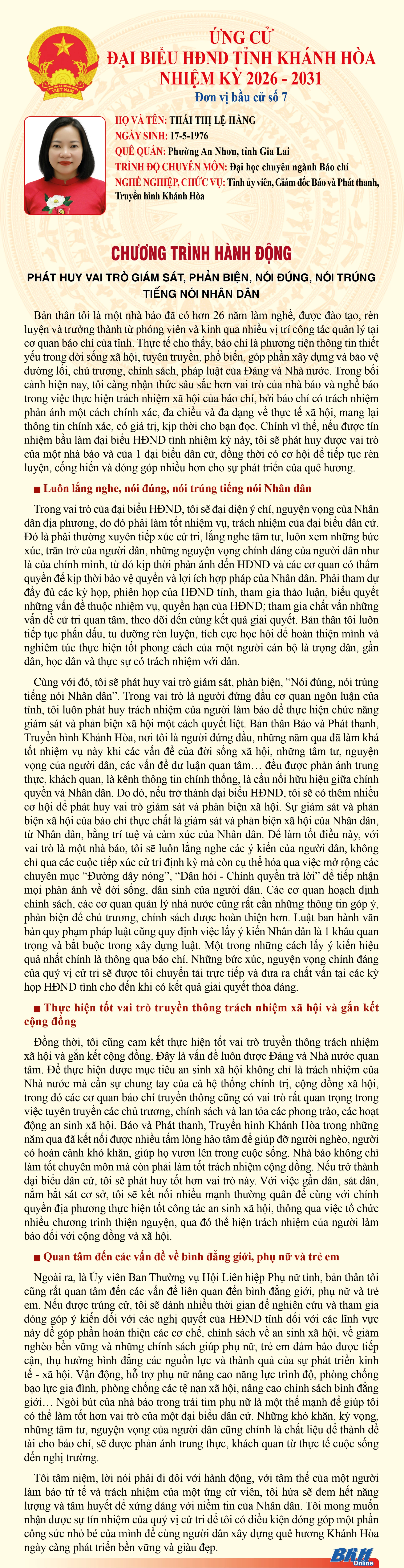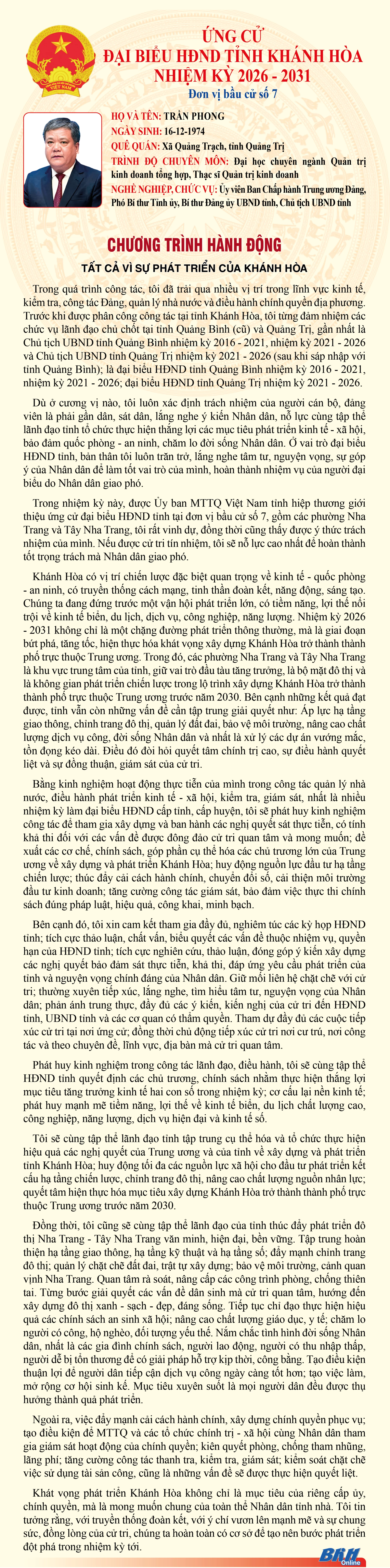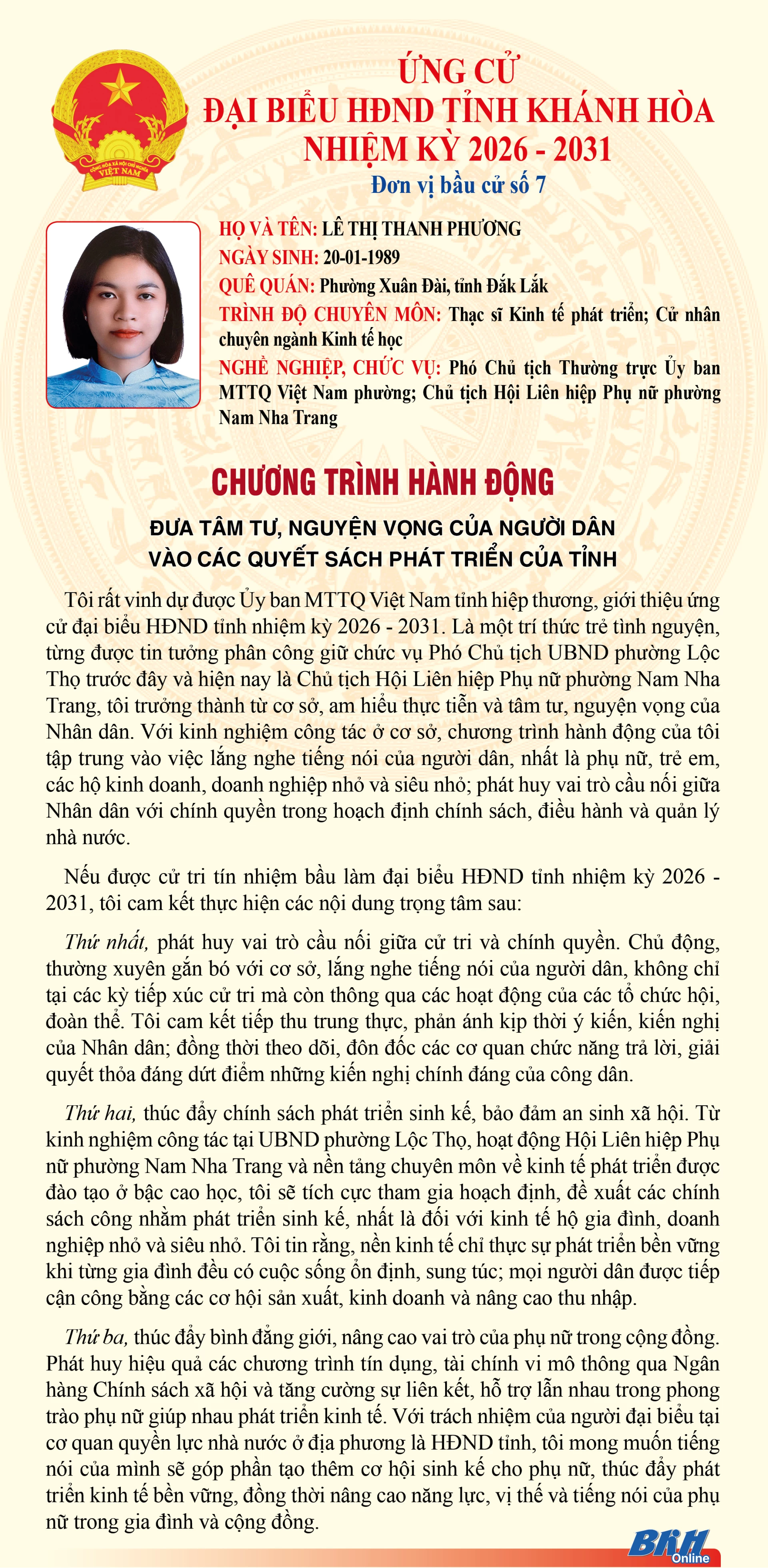 Báo và Phát thanh, Truyền hình Khánh Hòa trân trọng giới thiệu đến cử tri trong tỉnh chương trình hành động của những người ứng cử đại biểu HĐND tỉnh khóa VIII, nhiệm kỳ 2026 - 2031 tại Đơn vị bầu cử số 7 (Gồm: phường Tây Nha Trang, phường Nha Trang).