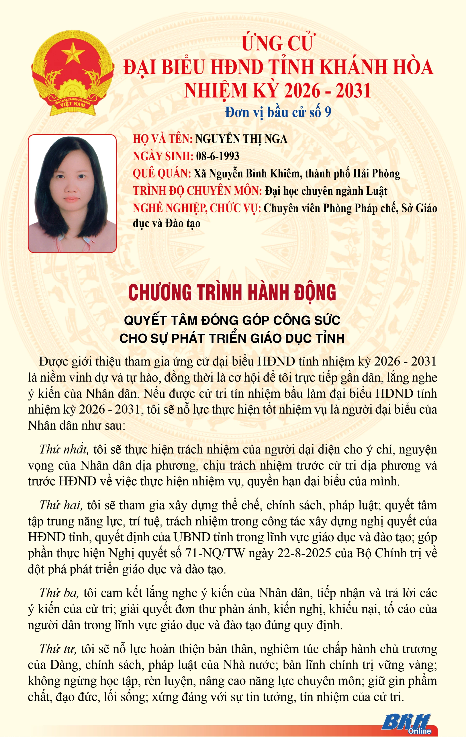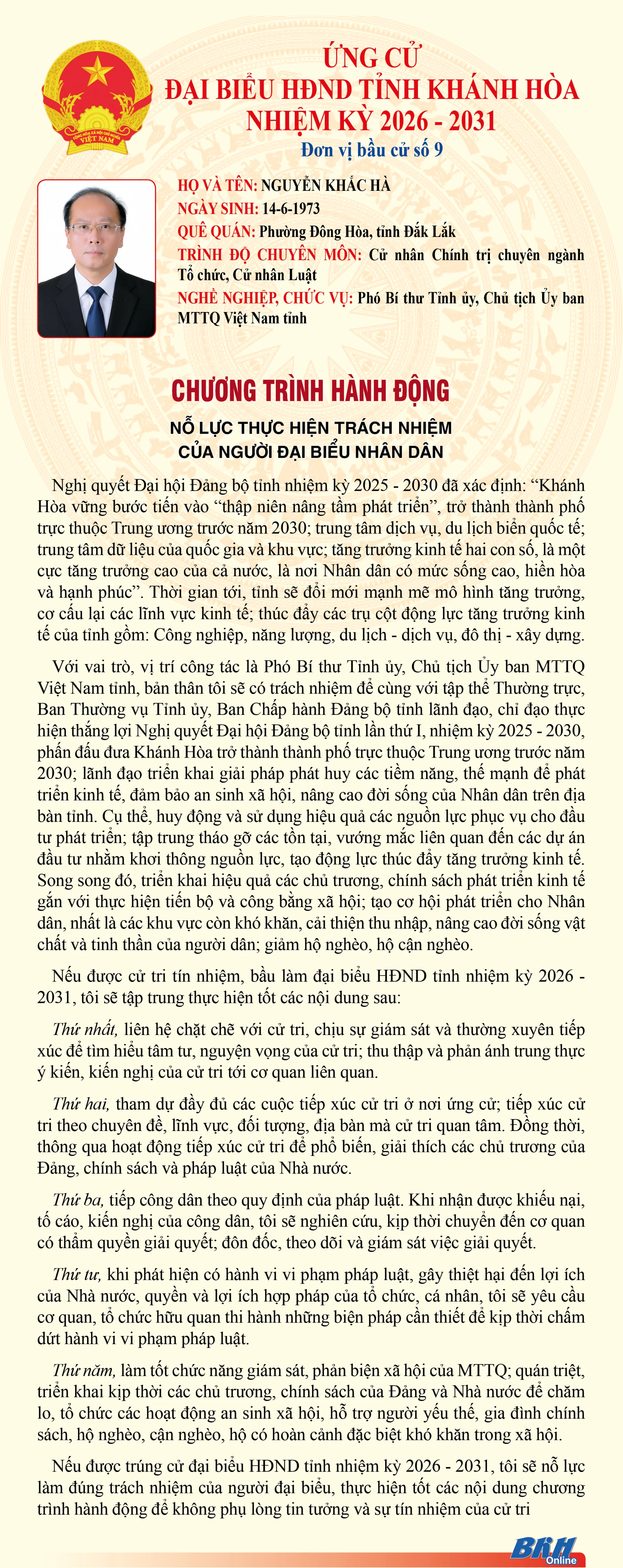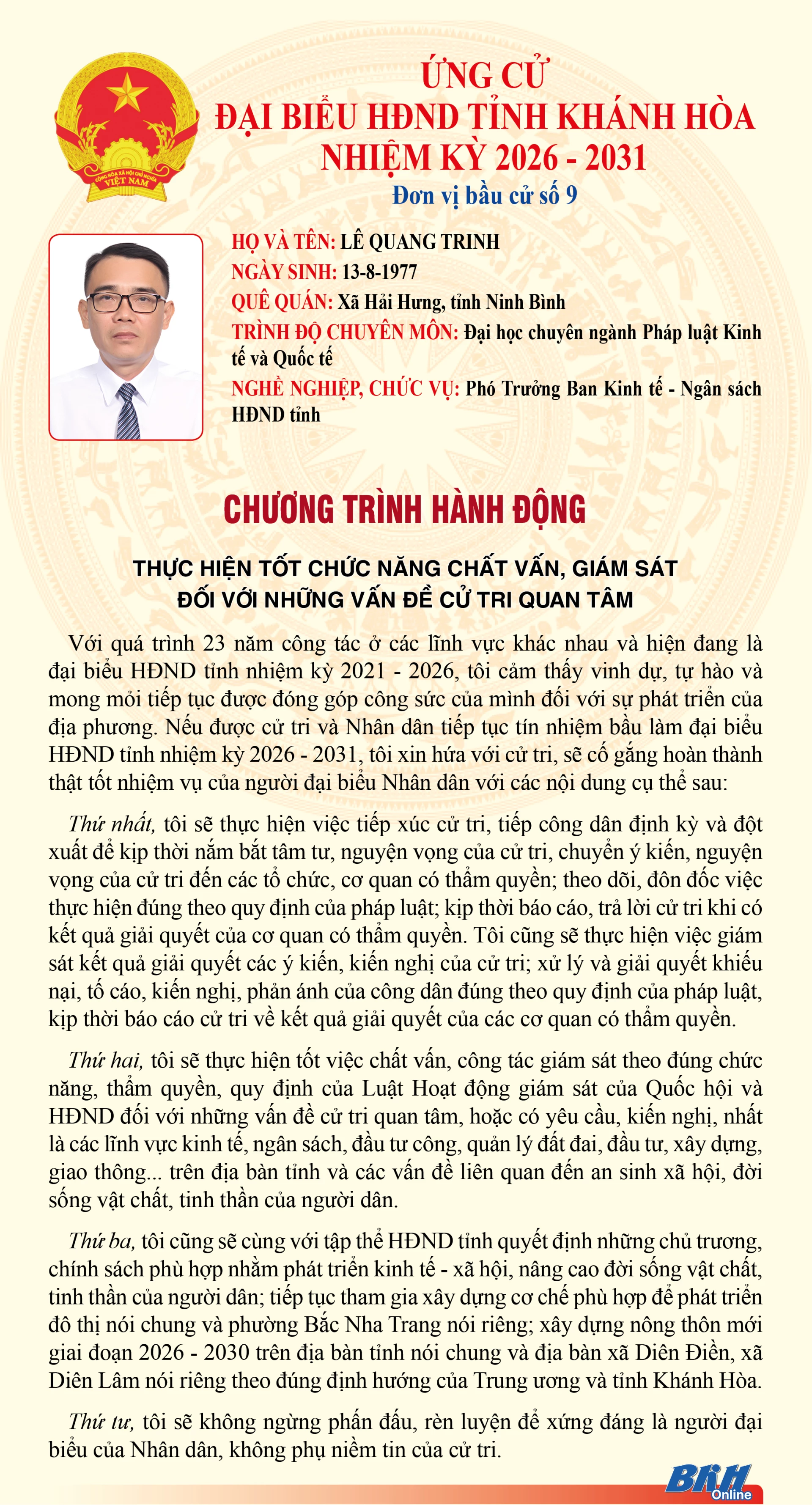 Báo và Phát thanh, Truyền hình Khánh Hòa trân trọng giới thiệu đến cử tri trong tỉnh chương trình hành động của những người ứng cử đại biểu HĐND tỉnh khóa VIII, nhiệm kỳ 2026 - 2031 tại Đơn vị bầu cử số 9 (Gồm: phường Bắc Nha Trang, xã Diên Điền, xã Diên Lâm).