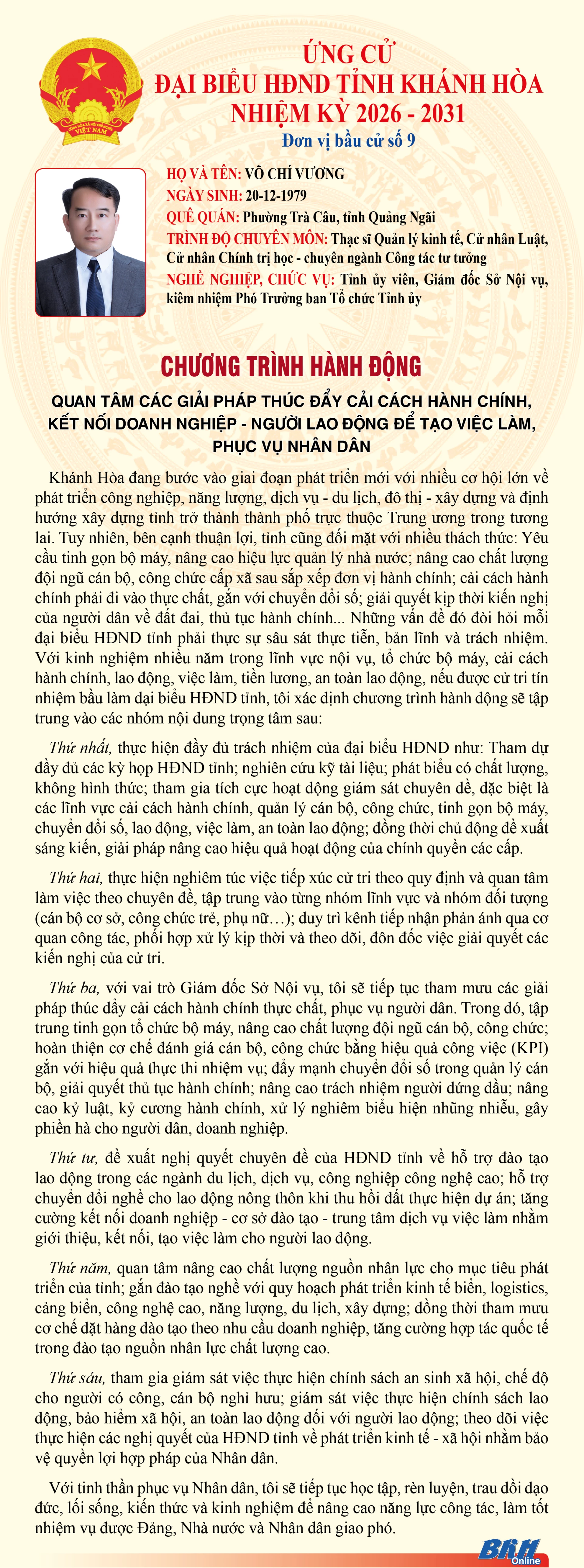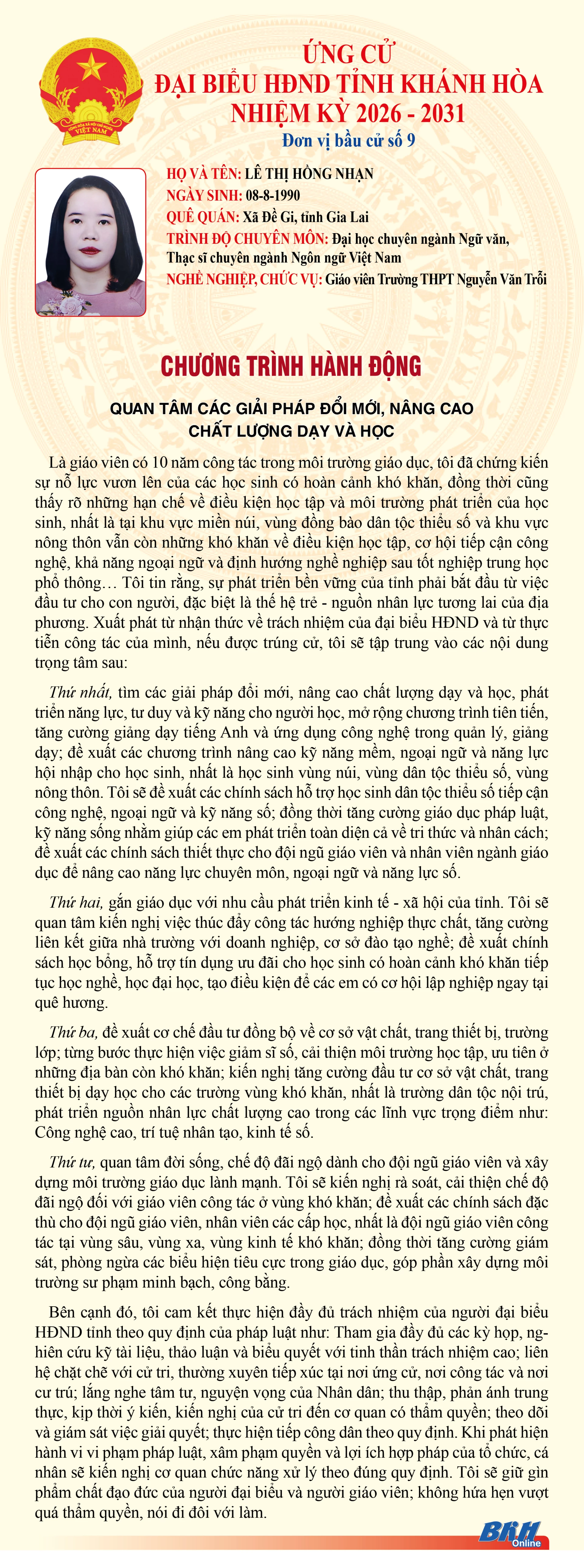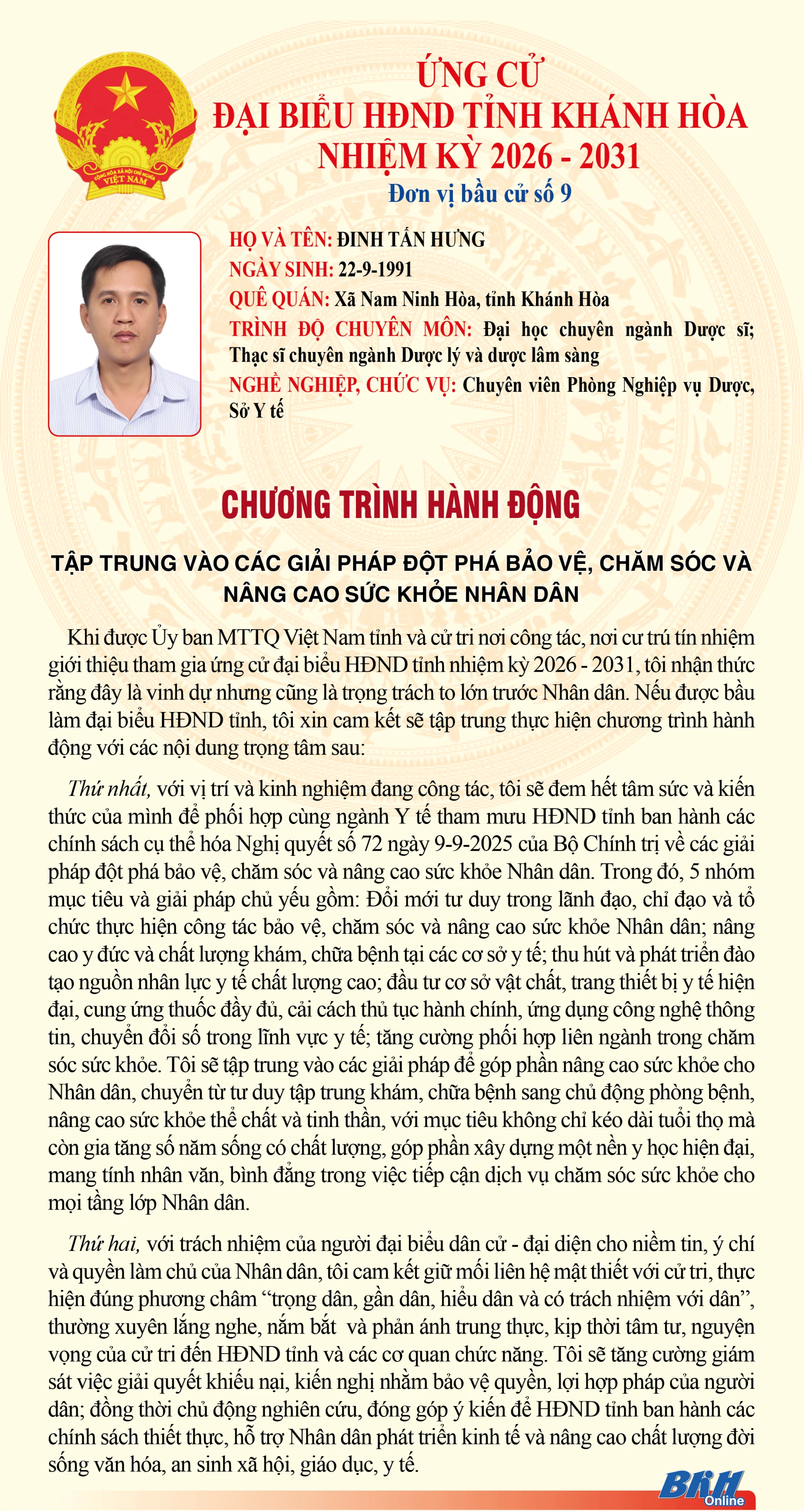 Báo và Phát thanh, Truyền hình Khánh Hòa trân trọng giới thiệu đến cử tri trong tỉnh chương trình hành động của những người ứng cử đại biểu HĐND tỉnh khóa VIII, nhiệm kỳ 2026 - 2031 tại Đơn vị bầu cử số 9 (Gồm: phường Bắc Nha Trang, xã Diên Điền, xã Diên Lâm).