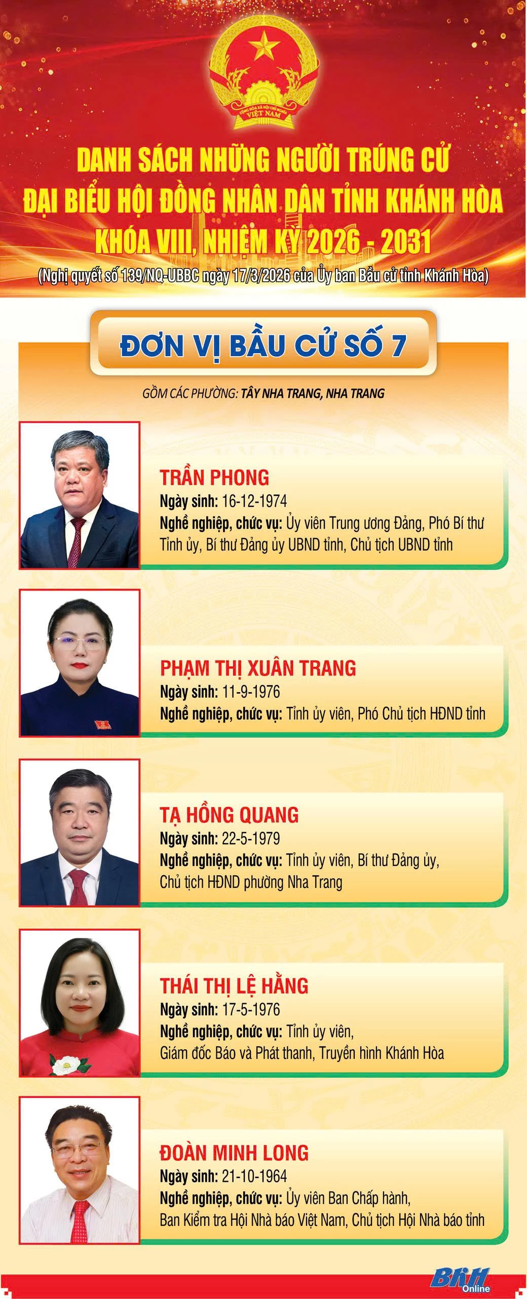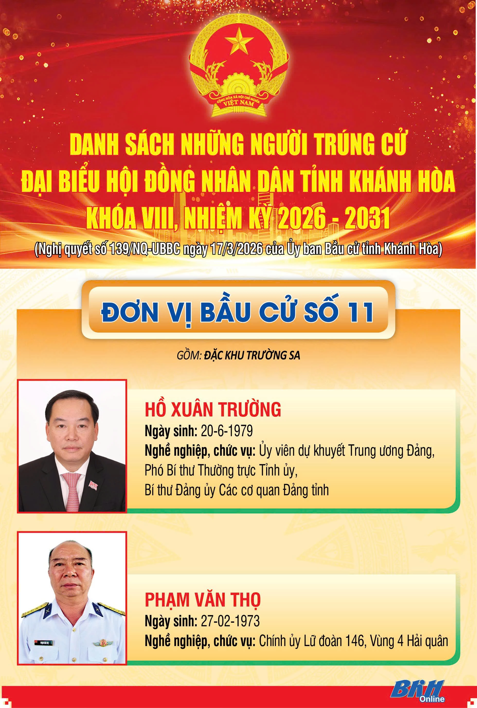 Ngày 17-3, Ủy ban Bầu cử tỉnh Khánh Hòa ban hành Nghị quyết số 138 về việc công bố kết quả đại biểu HĐND tỉnh nhiệm kỳ 2026 - 2031 tại từng đơn vị bầu cử và Nghị quyết số 139 về công bố danh sách chính thức những người trúng cử đại biểu HĐND tỉnh.