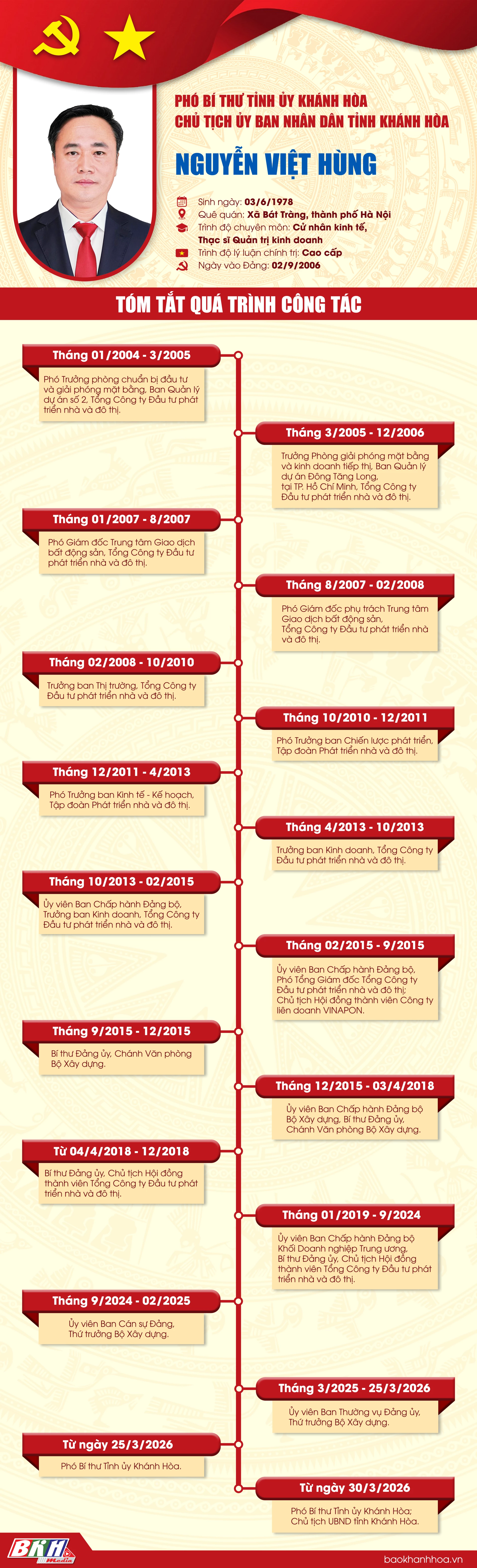 Báo và Phát thanh, Truyền hình Khánh Hòa xin trân trọng giới thiệu tóm tắt quá trình công tác của đồng chí Nguyễn Việt Hùng - Phó Bí thư Tỉnh ủy, Chủ tịch UBND tỉnh Khánh Hòa.
