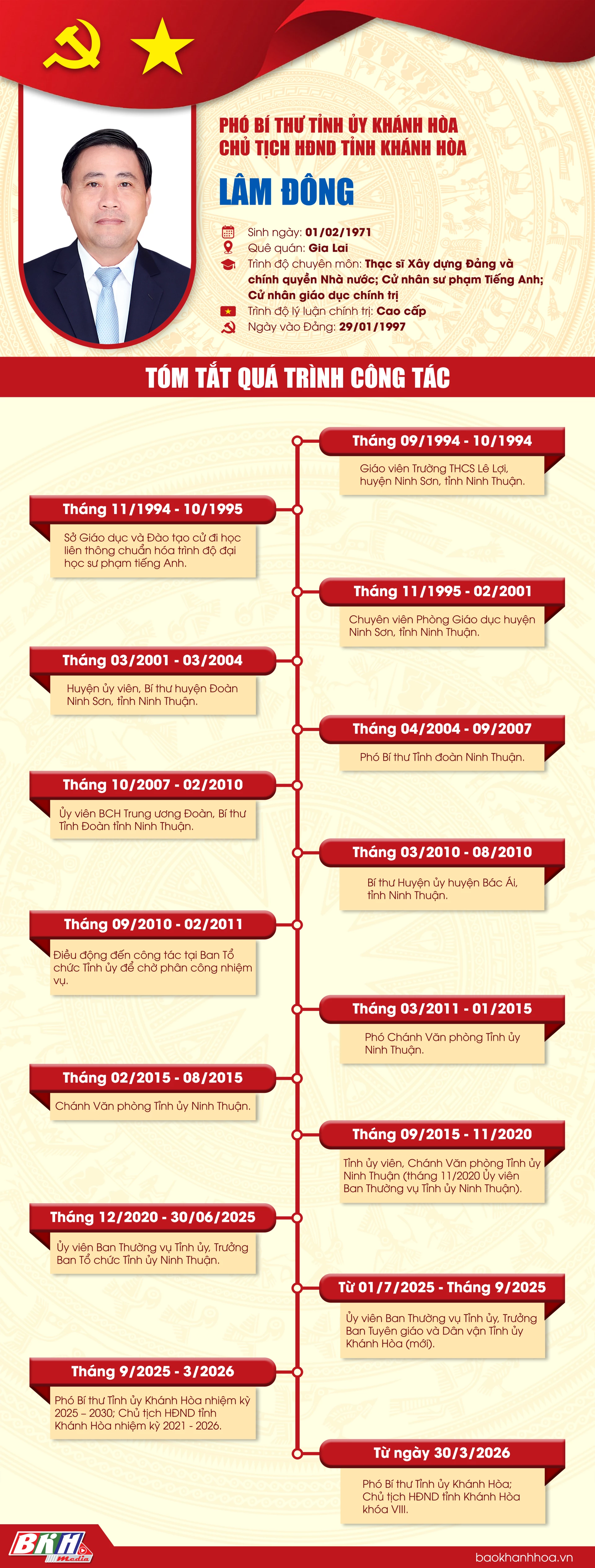 Báo và Phát thanh, Truyền hình Khánh Hòa xin trân trọng giới thiệu tóm tắt quá trình công tác của đồng chí Lâm Đông - Phó Bí thư Tỉnh ủy, Chủ tịch HĐND tỉnh Khánh Hòa.