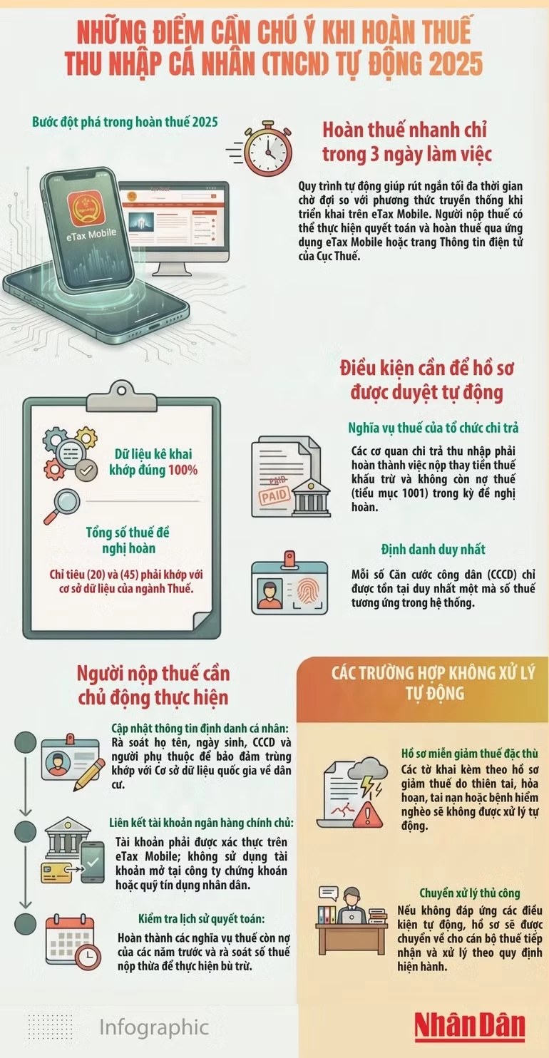 Bắt đầu từ năm 2025, ngành thuế sẽ triển khai quy trình hoàn thuế thu nhập cá nhân tự động thông qua ứng dụng eTax Mobile nhằm rút ngắn thời gian xử lý xuống chỉ còn 3 ngày làm việc.