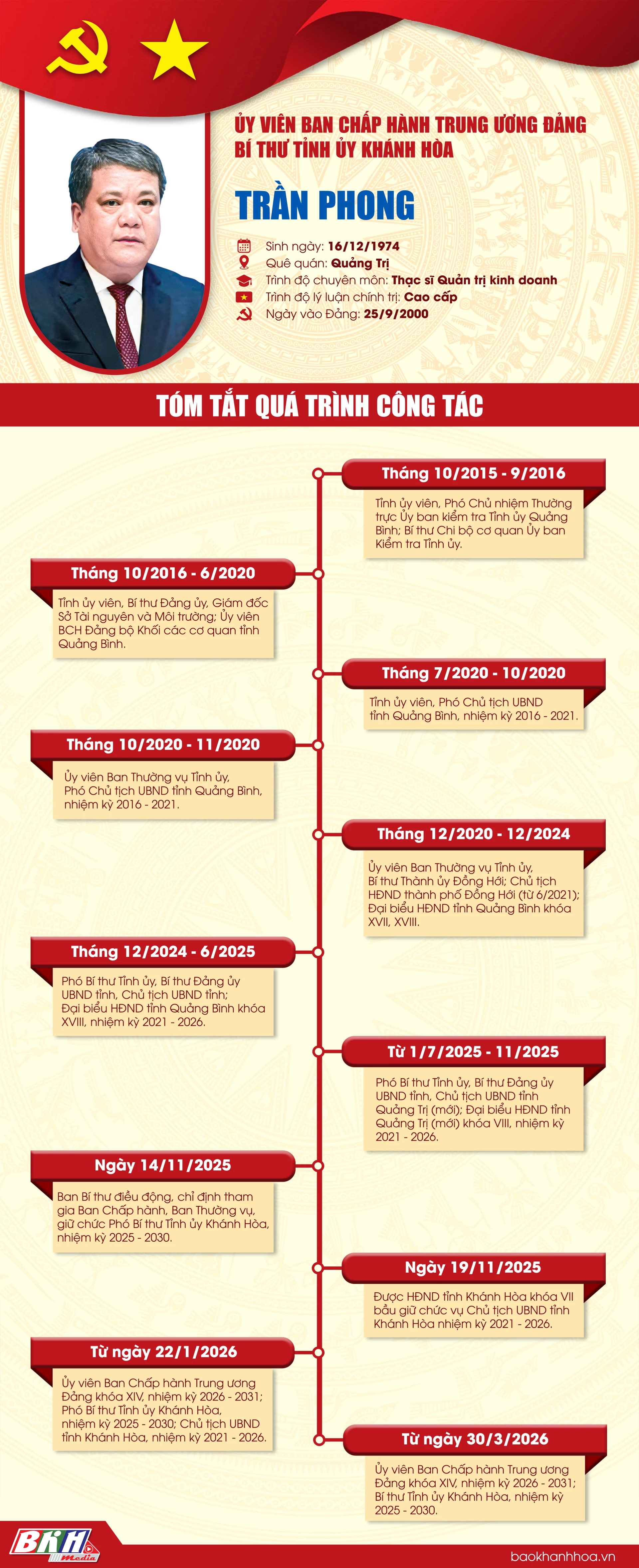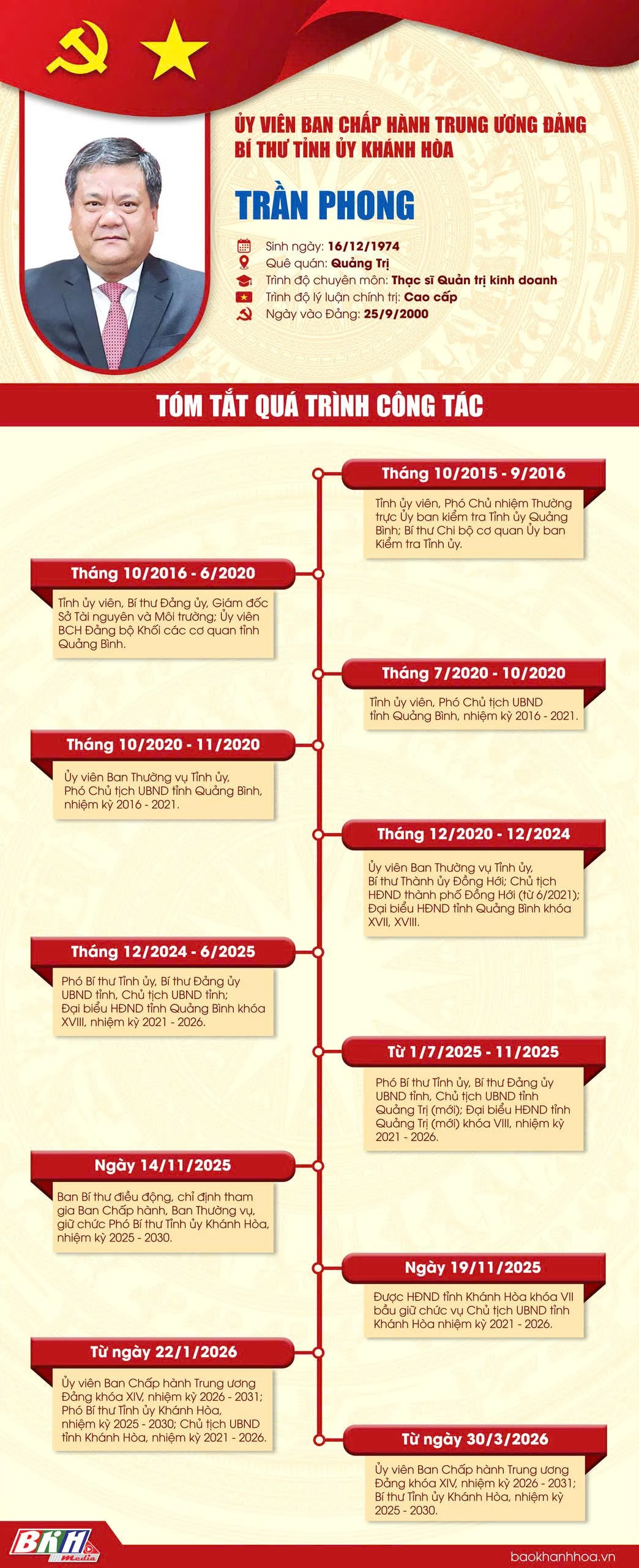 Báo và Phát thanh, Truyền hình Khánh Hòa xin trân trọng giới thiệu tóm tắt quá trình công tác của đồng chí Trần Phong - Ủy viên Ban Chấp hành Trung ương Đảng, Bí thư Tỉnh ủy Khánh Hòa.