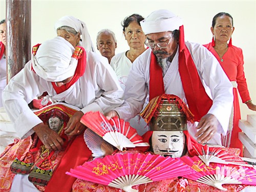 Các vị chức sắc thực hiện nghi thức mặc trang phục cho vợ chồng tổ nghề gốm Pôklong Chanh