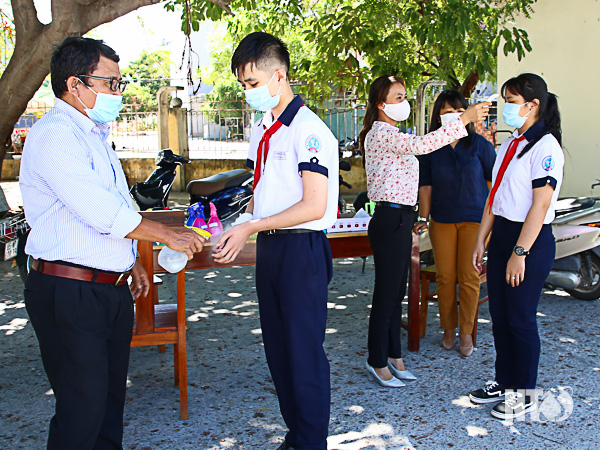 Khi HS trở lại học tập, Ban Giám hiệu các trường bố trí nhân viên y tế và GV đo thân nhiệt, hướng dẫn các em sát khuẩn tay ngay từ cổng trường. Cùng với đó, các trường tách lớp để đảm bảo giãn cách an toàn; GV, HS đeo khẩu trang trong quá trình dạy - học, hạn chế tiếp xúc đông người... Thầy giáo Trương Minh Tám, Hiệu trưởng Trường THPT Phan Chu Trinh (Ninh Hải) cho biết: Để làm tốt công tác phòng, chống dịch COVID-19 khi HS trở lại học tập, nhà trường thực hiện nghiêm túc việc đo thân nhiệt, hướng dẫn các em sát khuẩn tay ngay từ cổng trường. Ở mỗi lớp học, trường trang bị nước rửa tay khô và 1 bộ lau nhà để HS tổng vệ sinh sau mỗi buổi học. Song song đó, nhà trường tách 15 lớp, với 570 HS thành 30 lớp và chia thành 2 ca học sáng, chiều. Nhìn chung, sức khỏe của HS và GV ổn định, không có trường hợp sốt, ho, khó thở. Với tình hình dạy-học theo chương trình tinh giản của Bộ Giáo dục và Đào tạo (GD&ĐT) như hiện nay, nhà trường sẽ kịp hoàn thành chương trình theo kế hoạch của tỉnh.