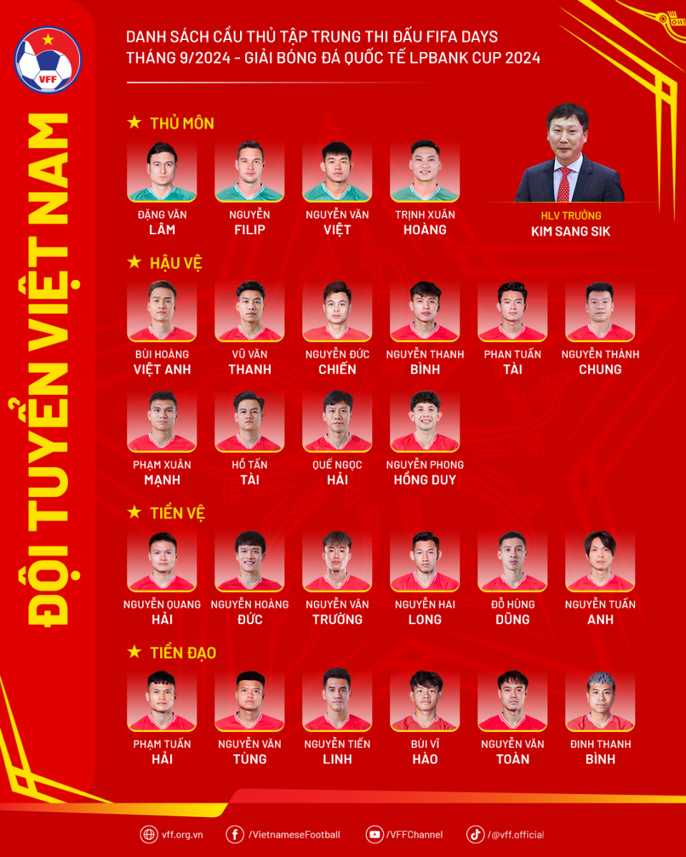 Ngày 22/8, theo thông tin từ Liên đoàn Bóng đá Việt Nam (VFF), Huấn luyện viên Kim Sang Sik đã công bố danh sách 26 cầu thủ Đội tuyển Việt Nam được lựa chọn cho đợt tập trung dịp FIFA Days tháng 9/2024.