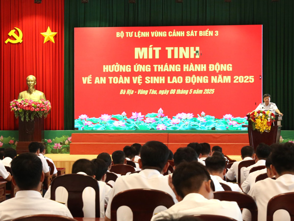 Chiều 8/5, tại Tp. Vũng Tàu, Bộ Tư lệnh Vùng Cảnh sát biển 3 tổ chức Lễ mít tinh hưởng ứng Tháng hành động về An toàn, vệ sinh lao động (ATVSLĐ) năm 2025. Đại tá Nguyễn Đức Hiếu, Phó Tư lệnh Pháp luật, Bộ Tư lệnh Vùng dự và chủ trì mít tinh.
