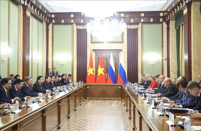 Nhắc lại kết quả tốt đẹp của chuyến thăm chính thức Việt Nam của Thủ tướng Mikhail Mishustin vào tháng 1/2025, cũng như chuyến thăm cấp Nhà nước đến Việt Nam của Tổng thống Vladimir Putin tháng 6/2024, Tổng Bí thư Tô Lâm khẳng định chuyến thăm lần này của Đoàn đại biểu cấp cao Việt Nam thể hiện sự coi trọng của Đảng, Nhà nước Việt Nam đối với quan hệ hữu nghị truyền thống và Đối tác chiến lược toàn diện Việt Nam - Liên bang Nga, cũng như quyết tâm chính trị cao của cả hai bên trong việc làm sâu sắc hơn nữa quan hệ song phương.