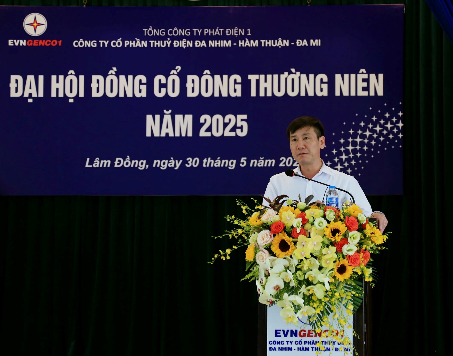 Phát biểu tại Đại hội, ông Đinh Kim Cương - Thành viên Hội đồng thành viên Tổng công ty Phát điện 1 (EVNGENCO1 - Cổ đông chiếm cổ phần chi phối của ĐHĐ) chúc mừng Công ty ĐHĐ đã hoàn thành các chỉ tiêu sản xuất kinh doanh mặc dù gặp nhiều khó khăn trong năm 2024.