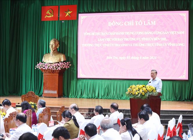 Sáng 3/6, tại tỉnh Bến Tre, Tổng Bí thư Tô Lâm và Đoàn công tác Trung ương đã làm việc với Ban Thường vụ Tỉnh ủy Bến Tre, Thường trực Tỉnh ủy Trà Vinh và Thường trực Tỉnh ủy Vĩnh Long về triển khai thực hiện các nghị quyết, kết luận, chỉ thị của Trung ương gần đây; tình hình thực hiện Nghị quyết số 60 - NQ/TW ngày 12/4/2025 của Ban Chấp hành Trung ương Đảng về Hội nghị lần thứ 11 Ban Chấp hành Trung ương Đảng khóa XIII.