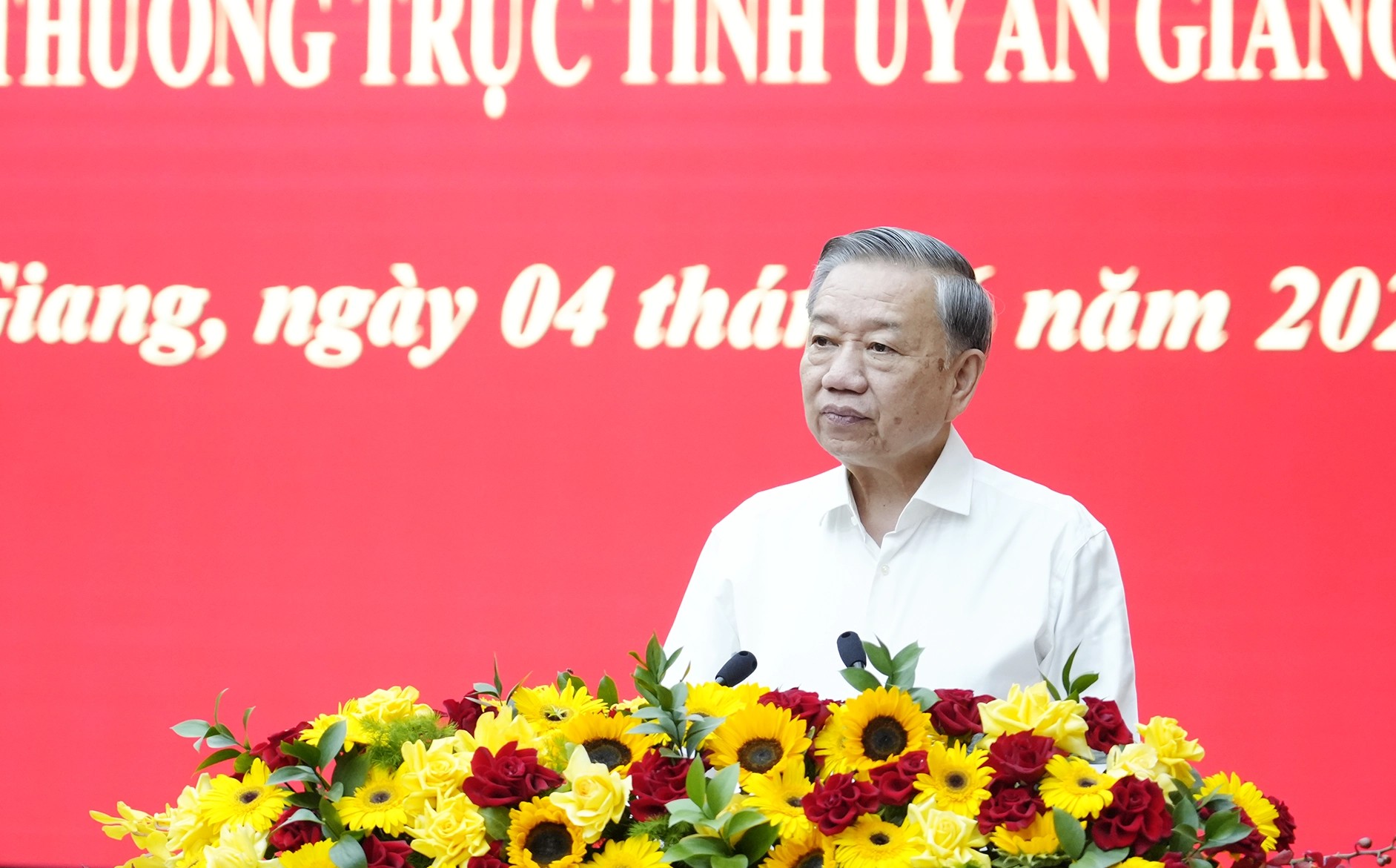 Sáng 4/6, tại Kiên Giang, Tổng Bí thư Tô Lâm và Đoàn công tác Trung ương đã làm việc với Ban Thường vụ Tỉnh ủy Kiên Giang và Thường trực Tỉnh ủy An Giang về triển khai thực hiện các nghị quyết, kết luận của Trung ương gần đây, việc sắp xếp tổ chức bộ máy của địa phương, công tác quốc phòng, an ninh, việc lãnh đạo thực hiện nhiệm vụ tăng trưởng kinh tế, công tác an sinh xã hội.
