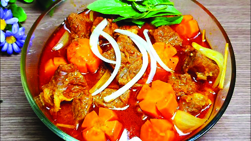 Cách làm: Thịt bò rửa sạch, thái thành miếng vuông vừa ăn. Đun một nồi nước sôi, thả gừng vào nồi và trần qua thịt bò trong vòng 2 phút để bỏ hết phần tạp chất ở thịt bò. Tỏi, hành tím bóc vỏ băm nhỏ. Sả bóc bớt phần già, đập dập, băm nhỏ phần gốc, giữ lại phần bên trên. Cà rốt, củ cải trắng, khoai tay nạo vỏ rửa sạch rồi bổ miếng vuông vừa ăn.