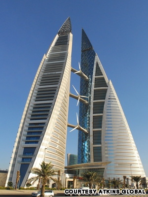 Vương quốc nhỏ của Bahrain là một trong những cấu trúc ấn tượng nhất của khu vực. Tạo nên từ hai tòa tháp được kết nối với nhau bởi 3 cây cầu. Trung tâm thương mại Thế giới ( WTO) là tòa nhà chọc trời đầu tiên trên thế giới đưa tua-bin gió vào thiết kế.