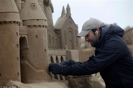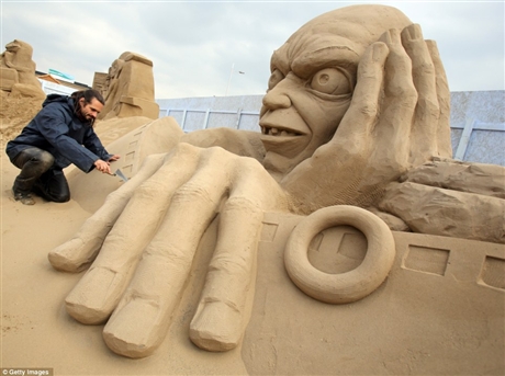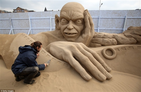 Với chủ đề Hollywood, chương trình Liên hoan điêu khắc trên cát đã quy tụ nhiều ngôi sao điện ảnh nổi tiếng Hollywood bằng cát. Trong ảnh, nghệ sĩ điêu khắc Radanvan Zivny đang hoàn thiện bức tượng cát nhân vật trong phim “Chúa tể của những chiếc nhẫn