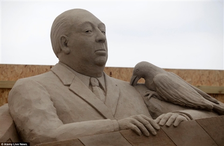 Nhà làm phim nổi tiếng người Anh Alfred Hitchcock được chạm khắc trên cát với chú chim đậu bên vai
