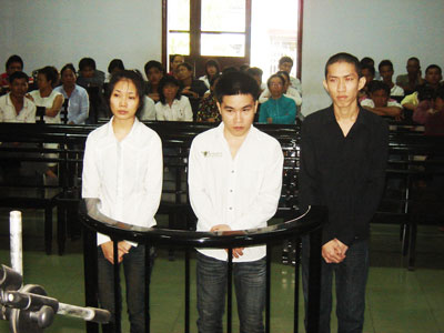 | Bị cáo Thu, Giang và Trung trước vành móng ngựa. |