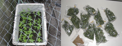 | Cây cần sa con được đối tượng Phan Hoàng Thạch trồng trong thùng xốp ngay trong vườn nhà (Ảnh trái) và Công an huyện Diên Khánh thu giữ hạt và lá cần sa khô tại nhà đối tượng Phan Hoàng Thạch. |