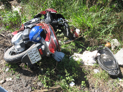 Chiếc xe máy của ông Phát bị hất văng sang lề đường, hư hỏng nặng. |