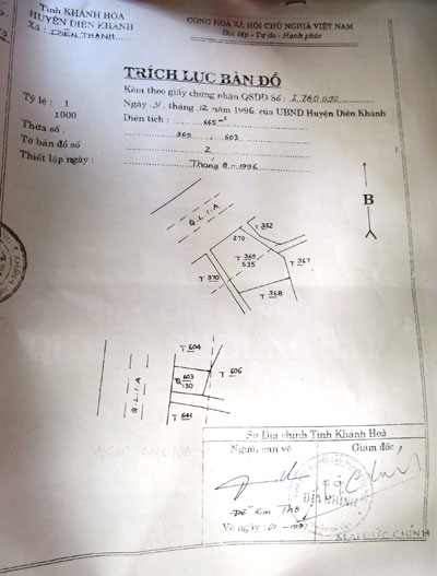 Đến năm 1996, khi mở đường 23-10 từ Nha Trang đến Cầu Lùng, gia đình ông bị thu hồi 140m2. Chiếu theo diện tích bị thu hồi thì diện tích đất còn lại của gia đình ông là 420m2. Tuy nhiên, không hiểu vì lý do gì, khi được cấp GCNQSDĐ mới, diện tích trong sổ vẫn thể hiện là 535m2. Chính điều bất hợp lý này dẫn đến việc gia đình ông phải nộp thuế cho Nhà nước với diện tích 535m2 (thực tế sử dụng chỉ có 420m2).