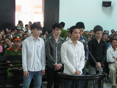 | Từ trái qua, các bị cáo: Hậu, Hiếu, Tâm, Tuấn, Minh. |