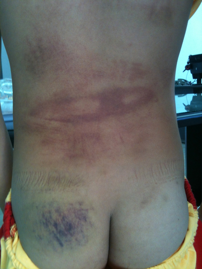 | Cháu Dũng bị bố đánh bầm tím mặt, lưng, mông. (Ảnh chụp ngày 11-7-2013) |