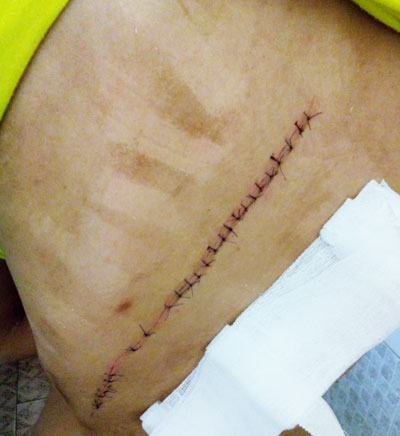 Khi nhóm thanh niên vừa đi khỏi, chị Trang cảm thấy yên tâm vì không có việc gì xảy ra. Tuy nhiên, một lúc sau, chị thấy một đối tượng đi xe máy chạy vụt qua, lúc này chị bỗng thấy có vật gì đó tác động vào người mình. Chị Trang đưa tay ra phía sau thì thấy chiếc áo đang mặc đã rách tả tơi. “Khi ấy tôi chưa thấy đau. Nhưng khi sờ lại phía lưng lần nữa thì tôi thấy đau, rát, máu chảy rất nhiều” - chị Trang nhớ lại. Chị Trang được người dân chở đến Bệnh viện Đa khoa khu vực Ninh Hòa cấp cứu. Tại đây, các bác sĩ đã khâu 26 mũi vắt ngang lưng của nạn nhân. Chị Huỳnh Thị Thu Dung - điều dưỡng trưởng Khoa Ngoại Bệnh viện Đa khoa khu vực Ninh Hòa cho biết, vết thương của chị Trang dài hơn 10cm, sâu khoảng 0,5cm. “Hiện bệnh nhân Trang đang tiếp tục được theo dõi và cho uống kháng sinh. Dự định 1 tuần sau, bệnh nhân mới có thể xuất viện” - chị Dung cho biết.