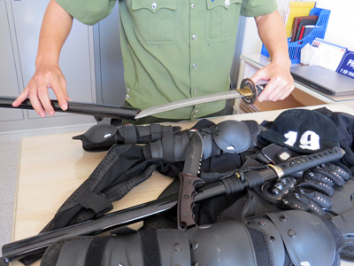 Áo giáp, khiên tự chế, dao, kiếm… mà công an thu được tại nơi ở của hai nghi phạm. |