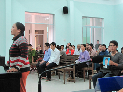 Bà Nguyễn Thị Huệ - vợ bị hại Lâm Tới (bìa trái) tỏ ra bức xúc khi nghe 2 bị cáo (ngồi hàng đầu, giữa ảnh) khai tại tòa. |