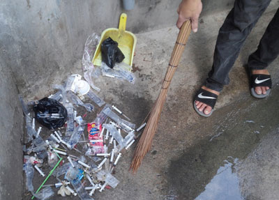 Ở một con hẻm nhỏ khác, bà T. cũng đã gom BKT thành nhiều đống. Khi chúng tôi đến, bà đang dùng kẹp gắp những BKT dắt trên bờ rào. Hình ảnh bà T. hàng ngày tình nguyện dọn BKT một cách cần mẫn ở con hẻm này không còn xa lạ với người dân trong khu vực. Bà T. chia sẻ: “8 năm trước, chứng kiến cảnh đứa cháu trai lượm BKT do con nghiện dắt ở bờ rào để chơi, tôi sợ vô cùng. Vì thế, từ đó đến nay, ngày nào tôi cũng đi gom BKT để hạn chế nguy hiểm cho những người đi qua con hẻm này. Nhưng tôi chỉ quét dọn được ở dưới đường, còn những BKT trên các mái nhà dọc con hẻm, thì tôi không leo lên quét được. Thời gian gần đây, con nghiện tụ tập hút chích ở khu vực này đông hơn, thường là vào giấc gần trưa, xế chiều và nhất là ban đêm. Không chỉ để lại BKT, chúng còn ói mửa hay phóng uế ngay ra đường. Chúng tôi chứng kiến nhưng không dám nói gì bọn chúng. Người dân nơi đây đã rất nhiều lần kêu cứu lên phường, nhưng tình trạng này vẫn tiếp diễn ngày một nhiều hơn”.