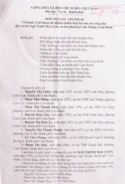 Theo đơn thư của 8 người dân ở TP. Cam Ranh, họ đã bị một thương lái thu mua hải sản trên địa bàn lợi dụng tín nhiệm để chiếm đoạt hàng trăm triệu đồng tiền hàng. Tuy Tòa án đã có phán quyết nhưng thương lái đó vẫn chây ì, không chịu thi hành án…