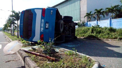| Bị tông trực diện, chiếc xe chở công nhân biển số 79B-00330 lật 2 vòng, làm đổ một biển báo giao thông, gãy một cây cau cảnh ở dải phân cách cứng. |