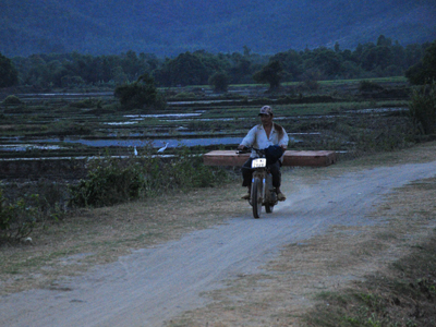 | Một đối tượng vận chuyển gỗ bằng xe máy qua thôn Bình Lộc 2 (xã Vạn Bình) - ảnh minh họa. |