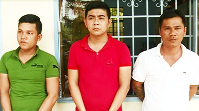 | Các đối tượng (từ trái qua) Nguyễn Hiếu Liêm, Lưu Hoàng Đức và Trần Thái Hải tại cơ quan điều tra. |