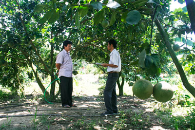 | Ông Triệu Văn Dũng (bên trái) lo lắng vườn bưởi da xanh của gia đình ông sẽ tiếp tục bị hái trộm |