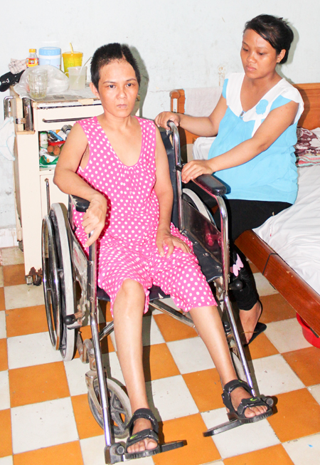 | Hiện tại, bà Thủy đã nhận thức được nhưng phải ngồi xe lăn vì bán thân bất toại |