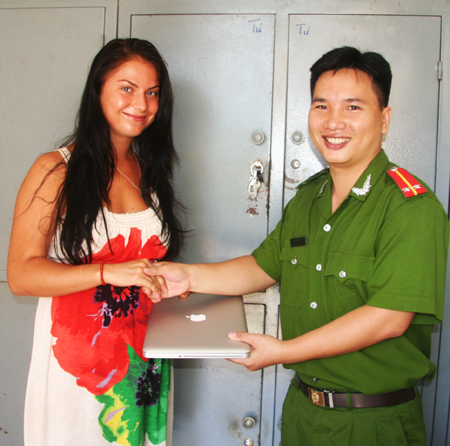 Ngày 17-6, Đội Cảnh sát điều tra tội phạm về trật tự xã hội Công an TP. Nha Trang tiến hành trao trả chiếc máy tính xách tay hiệu MacBook Air (trị giá hơn 10 triệu đồng) cho chị Olena Feiabova (27 tuổi, quốc tịch Ukraina), lưu trú tại một căn nhà cho thuê trên đường Nguyễn Thiện Thuật, phường Tân Lập, TP. Nha Trang.