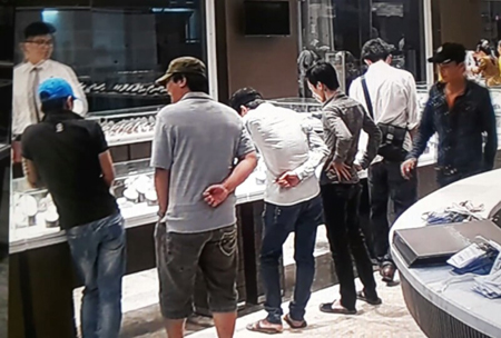| Nhóm người đến tìm gặp ông Minh tại Chi nhánh Công ty Ngọc trai Long Beach Pearl (cắt từ camera an ninh) |