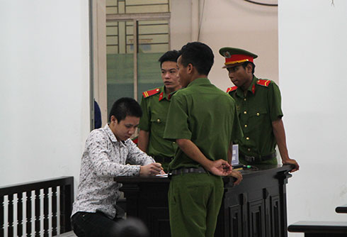 Bị cáo Nguyễn Văn Nghĩa viết giấy từ chối quyền nhờ người bào chữa ngay tại phiên tòa.