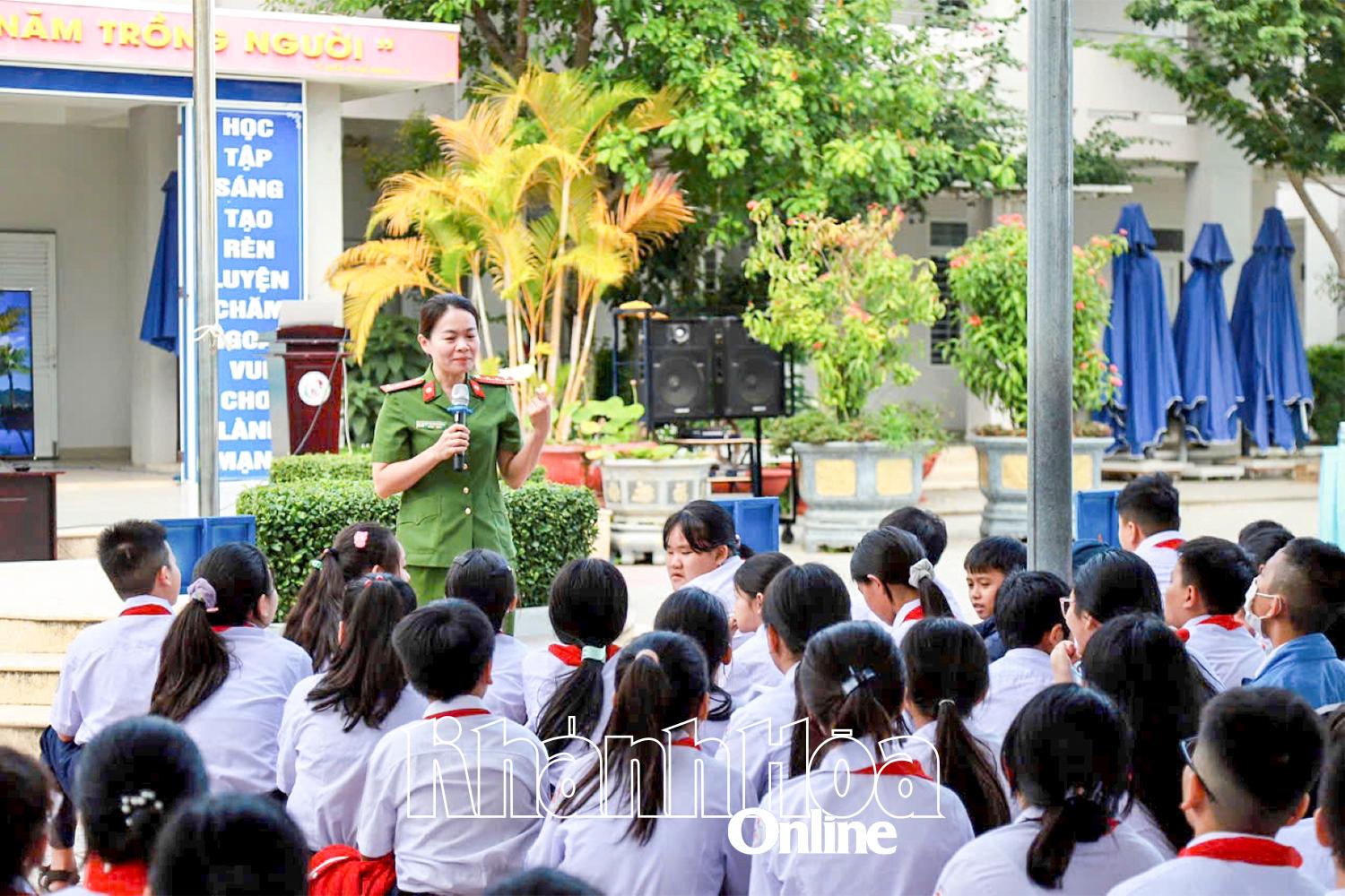 | Lực lượng Công an tỉnh lồng ghép tuyên truyền phương thức, thủ đoạn của tội phạm mua bán người với các loại tội phạm nguy hiểm khác cho học sinh trên địa bàn. |