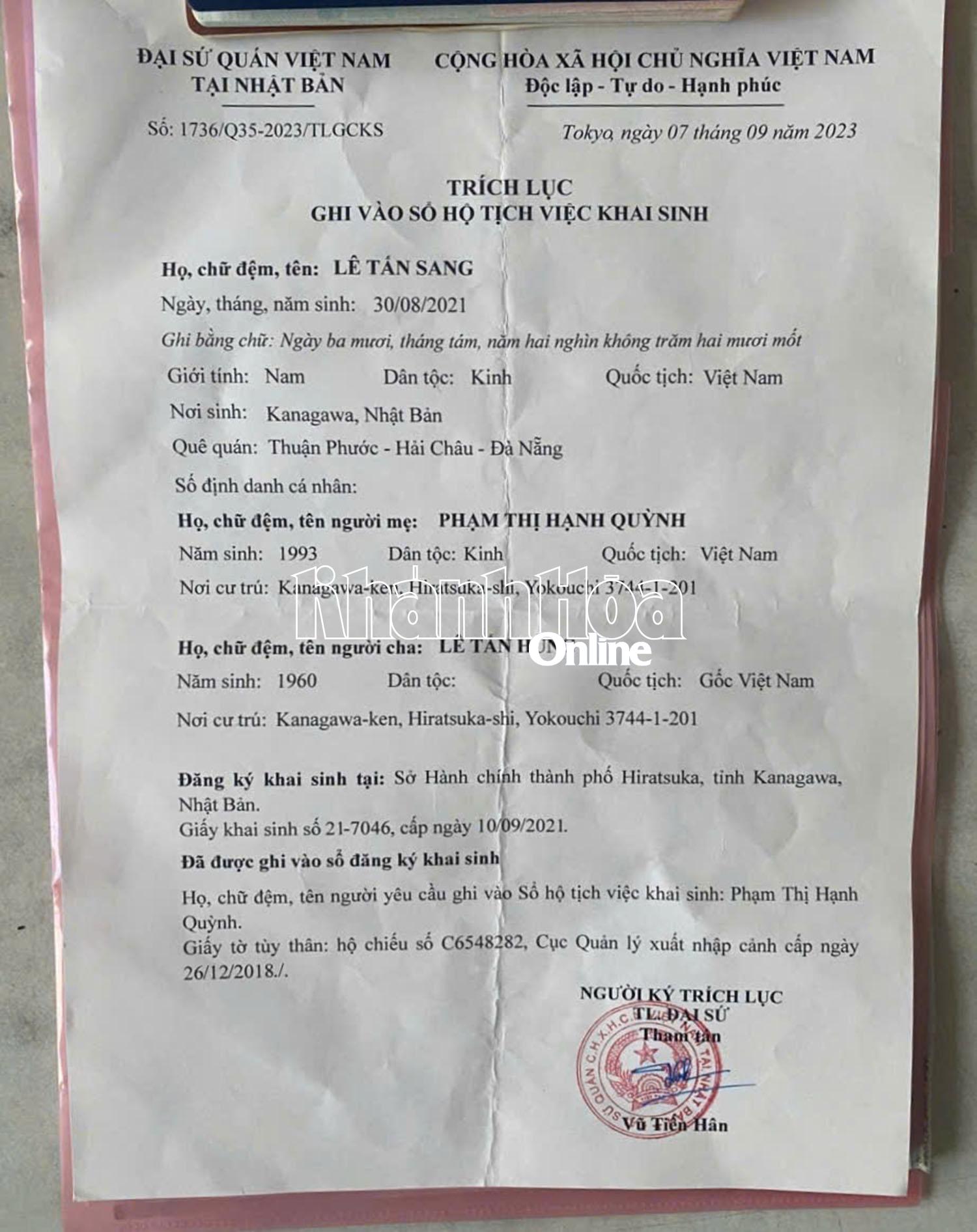 Kiểm tra hành lý của bé, tài xế phát hiện một số giấy tờ tùy thân. Theo đó, bé tên Lê Tấn Sang, sinh năm 2021 tại tỉnh Kanagawa, Nhật Bản; quê quán Thuận Phước, Hải Châu, Đà Nẵng. Cha bé là anh Lê Tấn Hùng và mẹ là chị Phạm Thị Hạnh Quỳnh, đều mang quốc tịch Việt Nam, cư trú tại tỉnh Kanagawa, Nhật Bản. Nghi ngờ có dấu hiệu bất thường, tài xế đã nhanh chóng đưa bé đến trụ sở Công an phường Nha Trang trình báo sự việc.