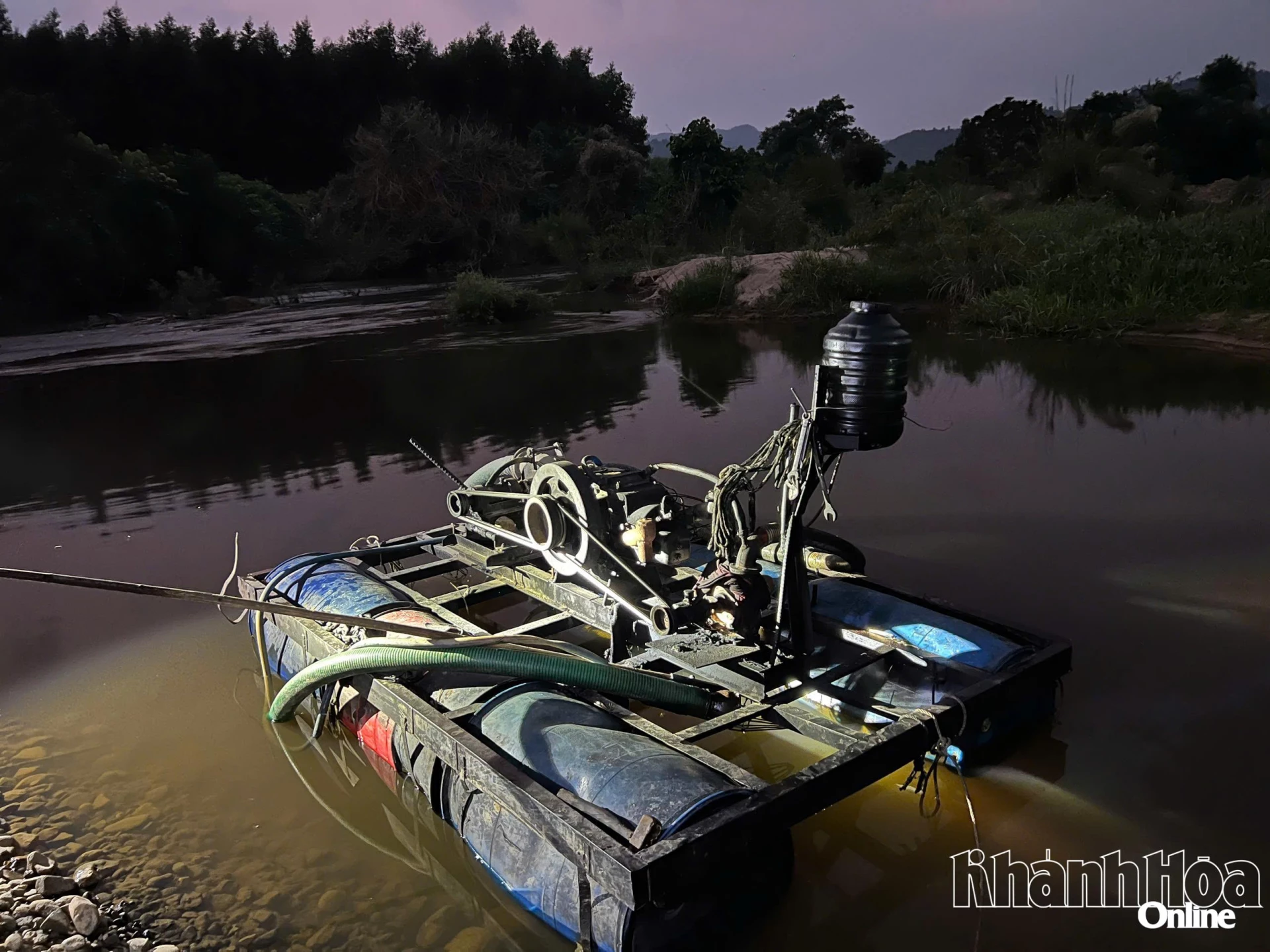 Vào khoảng 16 giờ 45 phút, tổ công tác phát hiện một phương tiện khai thác tự chế đang bơm hút cát dưới lòng sông, sau đó vận chuyển lên 3 xe ô tô tải ben. Qua kiểm tra, lực lượng chức năng xác định toàn bộ hoạt động khai thác và vận chuyển khoáng sản đều không có giấy phép hợp pháp. Các phương tiện và tài xế liên quan gồm: Xe ô tô tải ben biển kiểm soát 79C-136.19, do Bùi Văn Phát (trú xã Bắc Khánh Vĩnh) điều khiển; xe ô tô tải ben biển kiểm soát 79H-001.64, do Nguyễn Ngọc Tuấn (trú xã Diên Lâm) điều khiển; xe ô tô tải ben biển kiểm soát 79C-169.81, do Vũ Viết Diệp (trú xã Bắc Khánh Vĩnh) điều khiển. Chủ phương tiện khai thác cát tự chế là Nguyễn Văn Anh Nam (trú xã Trung Khánh Vĩnh). Tại hiện trường, mỗi xe đã được bơm đầy khoảng 7,5m³ cát.
