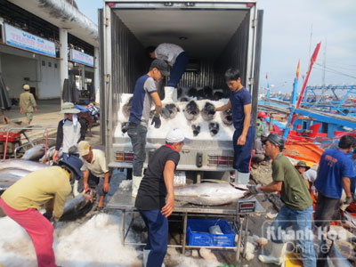 Tại các cảng cá, hoạt động mua bán, vận chuyển cá diễn ra khá nhộn nhịp. Tàu về cảng, lập tức các thương lái có mặt để thu mua, đưa cá đến các nhà máy chế biến. Cá ngừ đại dương có giá 90.000 - 100.000 đồng/kg, cá loại 1 giảm từ 5 - 10% so với trước Tết. Mỗi tàu khai thác được từ 20 đến 70 con cá ngừ, với sản lượng từ 1,5 đến 4 tấn. Tính ra mỗi tàu thu về từ 150 triệu đến gần 400 triệu đồng, hầu hết các tàu đều có lãi hoặc hòa vốn. Tại Cảng cá Hòn Rớ, tàu cá KH96176 vừa cập cảng, mang về những con cá ngừ đại dương đen bạc lấp lánh. Một chiếc xe hàng trờ tới, các bạn tàu ai cũng vội vã đưa cá từ khoang tàu lên cầu cảng. Có những con lên đến cả tạ, phải cần tới 4, 5 bạn thuyền mới kéo được ra khỏi khoang. Bà Huỳnh Thị Luynh, chủ tàu cá này phấn khởi cho biết, tàu của gia đình bà cùng 7 ngư dân xuất bến từ ngày 17 tháng Chạp, nay trở về được 40 con cá ngừ đại dương, có những con lên đến gần 110kg. “Đi dịp Tết, anh em đi bạn xa gia đình, rất khổ. Sau khi trừ các phí tổn hết 100 triệu, nhẩm tính mỗi người kiếm được 7 triệu đồng, cũng đáng công của anh em ”- bà Luynh nói.