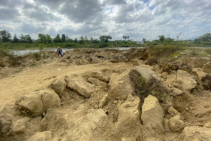 Không chỉ dưới lòng sông Cái, trên bờ sông, tình trạng khai thác cát cũng diễn ra giữa ban ngày. Cụ thể, trưa 9-3, phóng viên có mặt tại khu vực người dân địa phương gọi là Bến Bà Đào (thôn Trung, xã Diên Lâm), phía sau trụ sở UBND xã Diên Lâm. Tại đây, người dân dùng xe bò liên tục di chuyển thành hàng ra bờ sông xúc cát, rồi chậm rãi chở về. Sông Cái mùa này nước cạn nên các đối tượng dùng thuyền gỗ (không gắn động cơ) để lấy cát. Người đẩy thuyền, người xúc cát lên cho thuyền thật khẳm rồi đẩy đi. Hoạt động khai thác cát diễn ra nhiều năm đã khiến khu vực này từ địa hình bằng phẳng, kết cấu đất vững chắc nay đã tan hoang. Điều đáng nói hơn, để ngăn sạt lở, Nhà nước đã đầu tư ở khu vực này dãy kè bê tông vững chắc, nhưng khi đất, cát bị lấy đi, bờ kè bị nứt vỡ nhiều phần, có nơi chỉ còn trơ lại móng kè. Bà V.T (người dân thôn Trung) xót xa cho biết, việc khai thác đất, cát ở Bến Bà Đào diễn ra khoảng 5-6 năm nay, hết cát ở sông, đến đất trên bờ lần lượt bị khai thác. Người khai thác chủ yếu là người dân trong xã, múc từng xe đất, cát để về xây nhà, san lấp mặt bằng, có người đem bán. Người dân đã báo cho UBND xã Diên Lâm nhiều lần, nhưng lực lượng của địa phương chỉ ra kiểm tra, nhắc nhở, được vài hôm xe bò lại vẫn từng đoàn nối đuôi nhau ra sông xúc cát.