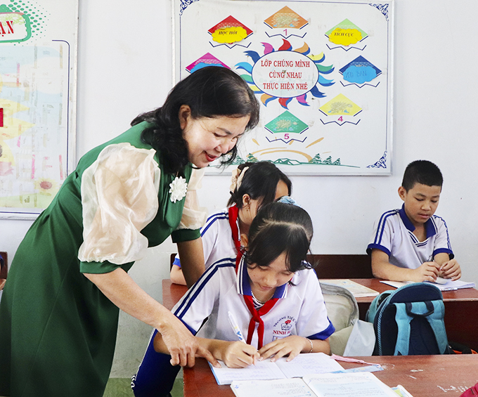 Em Nguyễn Điêu Sương Mai trong một giờ học ở lớp. |